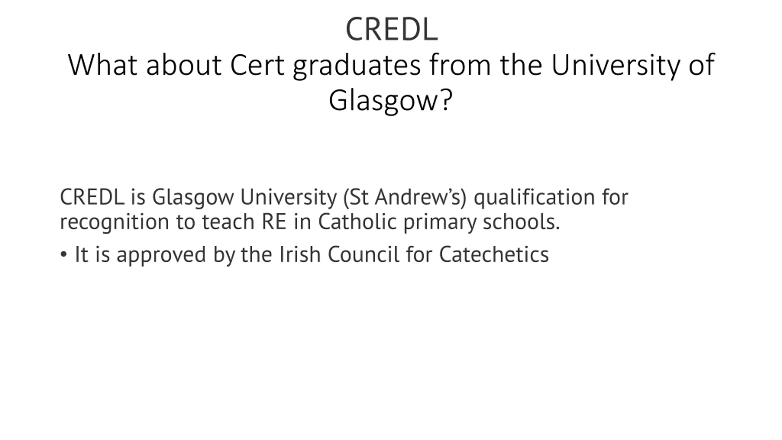 CREDL What about Cert graduates from the University of Glasgow? CREDL is Glasgow University (St Andrew s) qualification for recognition to teach RE in Catholic primary schools. It is approved by the Irish Council for Catechetics