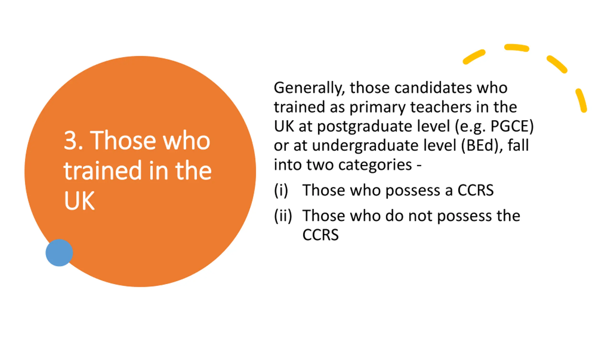 Generally, those candidates who trained as primary teachers in the UK at postgraduate level (e.g. PGCE) or at undergraduate level (BEd), fall into two categories - (i) Those who possess a CCRS (ii) Those who do not possess the CCRS 3. Those who 3. Those who trained in the trained in the UK UK