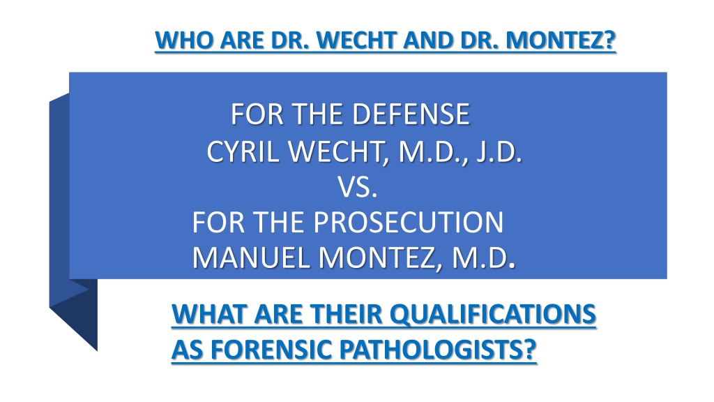 WHO ARE DR. WECHT AND DR. MONTEZ? FOR THE DEFENSE CYRIL WECHT, M.D., J.D. VS. FOR THE PROSECUTION MANUEL MONTEZ, M.D. WHAT ARE THEIR QUALIFICATIONS AS FORENSIC PATHOLOGISTS?