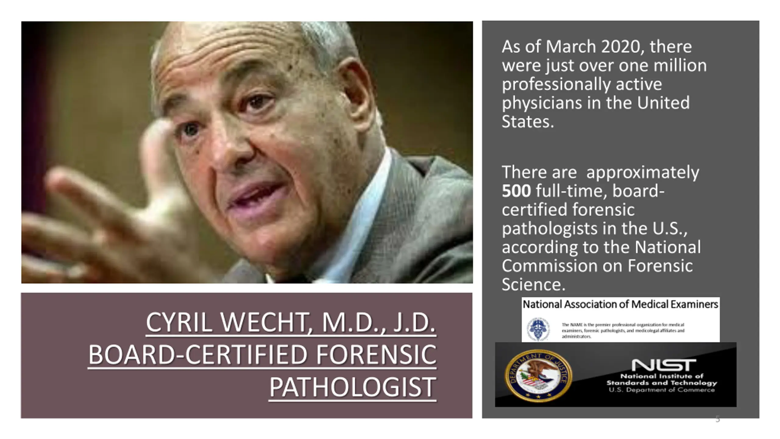 As of March 2020, there were just over one million professionally active physicians in the United States. There are approximately 500 full-time, board- certified forensic pathologists in the U.S., according to the National Commission on Forensic Science. BOARD-CERTIFIED FORENSIC CYRIL WECHT, M.D., J.D. PATHOLOGIST 5