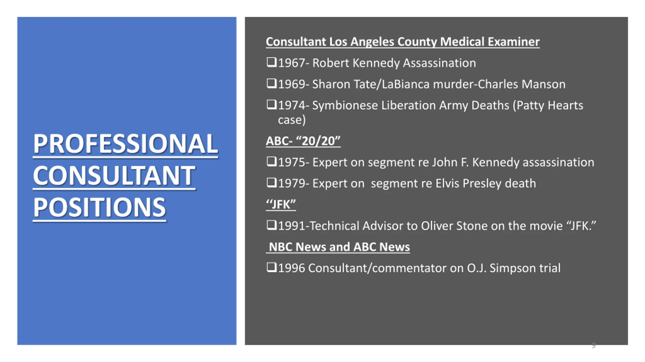 Consultant Los Angeles County Medical Examiner 1967- Robert Kennedy Assassination 1969- Sharon Tate/LaBianca murder-Charles Manson 1974- Symbionese Liberation Army Deaths (Patty Hearts case) PROFESSIONAL CONSULTANT POSITIONS ABC- 20/20 1975- Expert on segment re John F. Kennedy assassination 1979- Expert on segment re Elvis Presley death JFK 1991-Technical Advisor to Oliver Stone on the movie JFK. NBC News and ABC News 1996 Consultant/commentator on O.J. Simpson trial 9