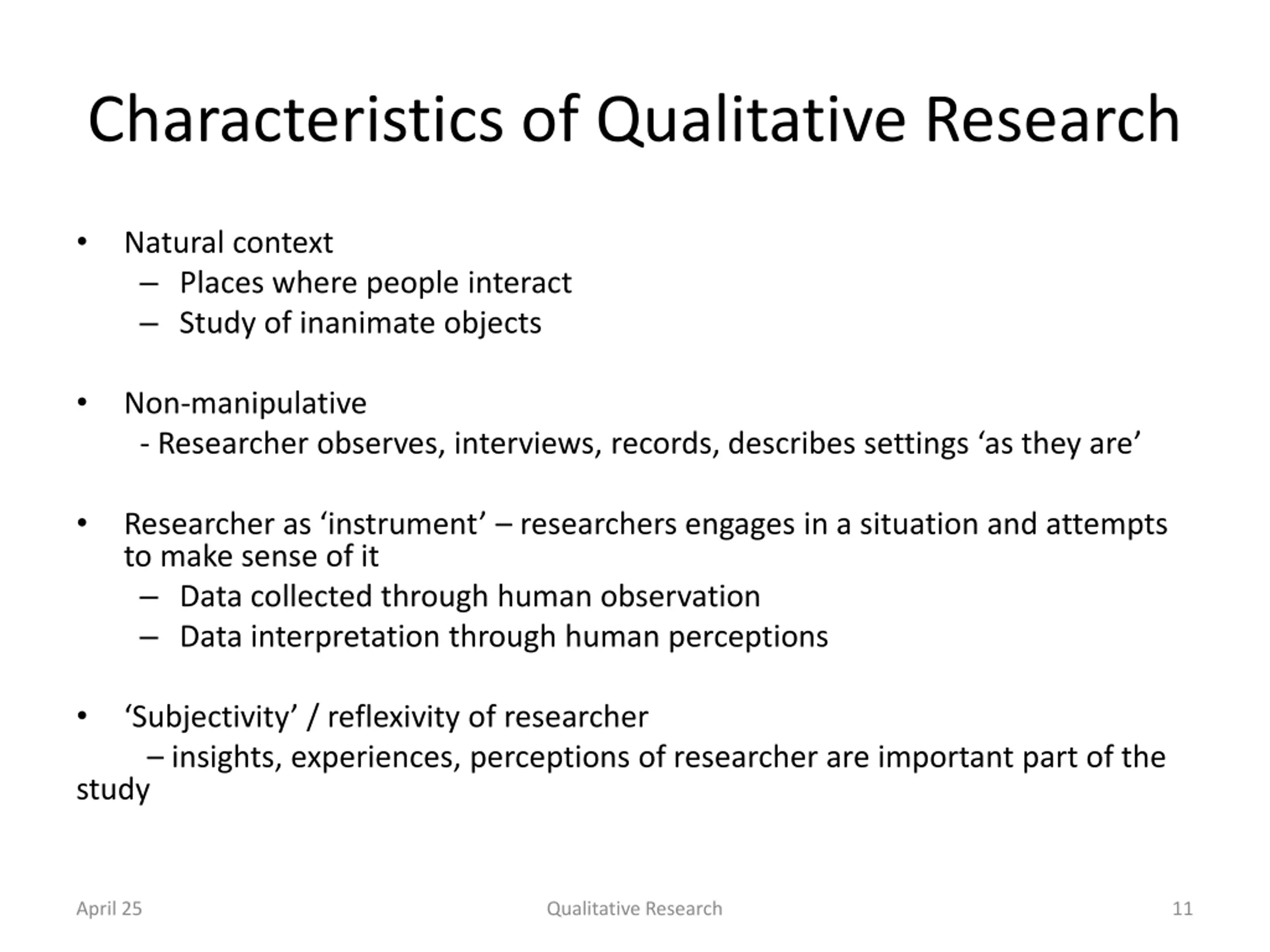 Characteristics of Qualitative Research Natural context Places where people interact Study of inanimate objects Non-manipulative - Researcher observes, interviews, records, describes settings as they are Researcher as instrument researchers engages in a situation and attempts to make sense of it Data collected through human observation Data interpretation through human perceptions study Subjectivity / reflexivity of researcher insights, experiences, perceptions of researcher are important part of the April 25 Qualitative Research 11