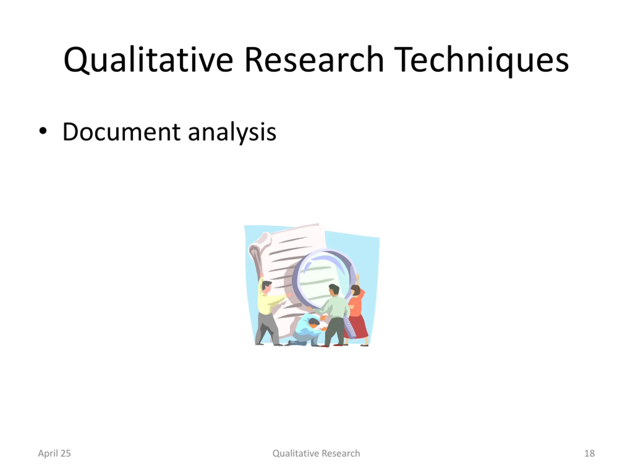 Qualitative Research Techniques Document analysis April 25 Qualitative Research 18