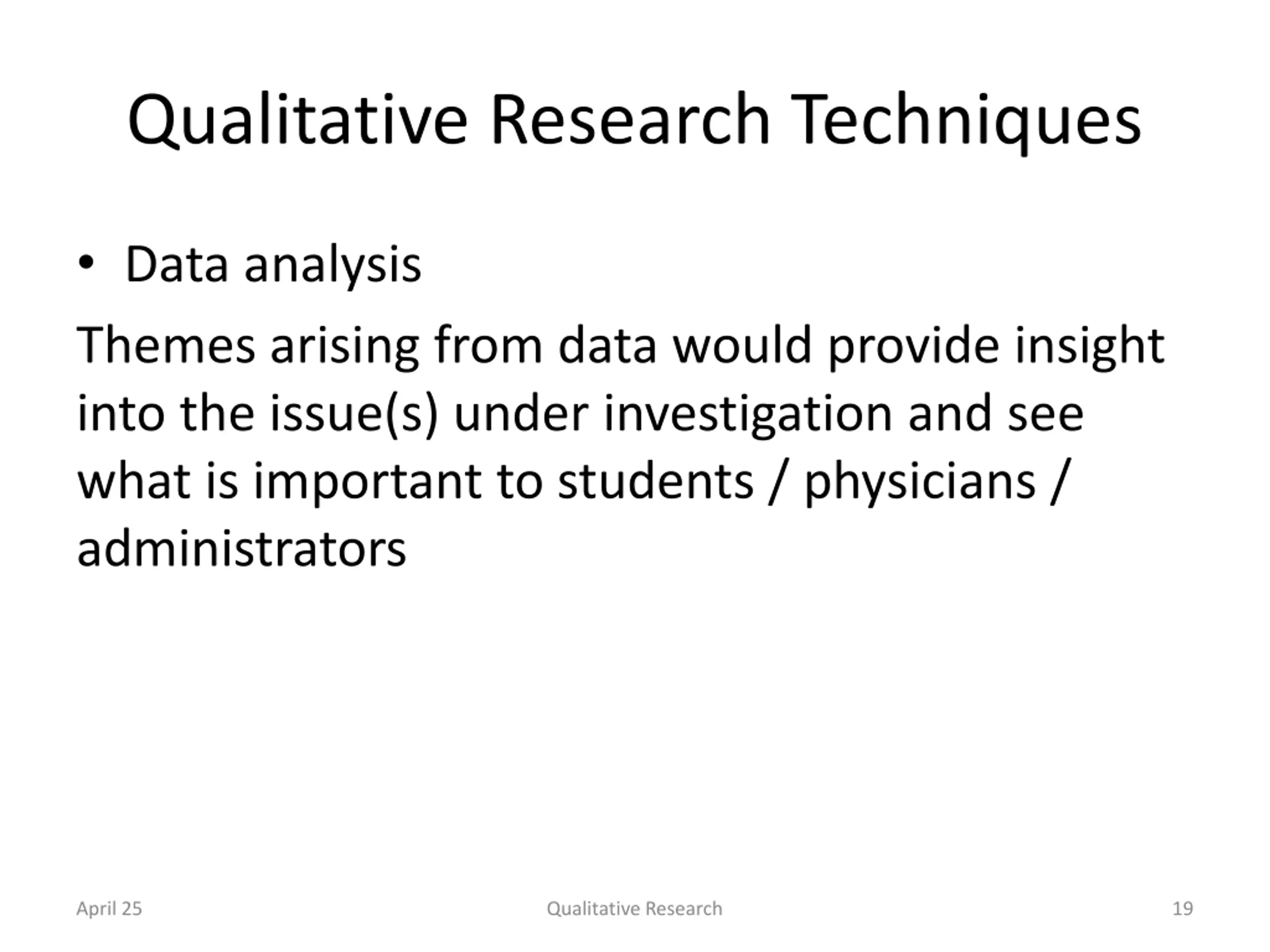 Qualitative Research Techniques Data analysis Themes arising from data would provide insight into the issue(s) under investigation and see what is important to students / physicians / administrators April 25 Qualitative Research 19