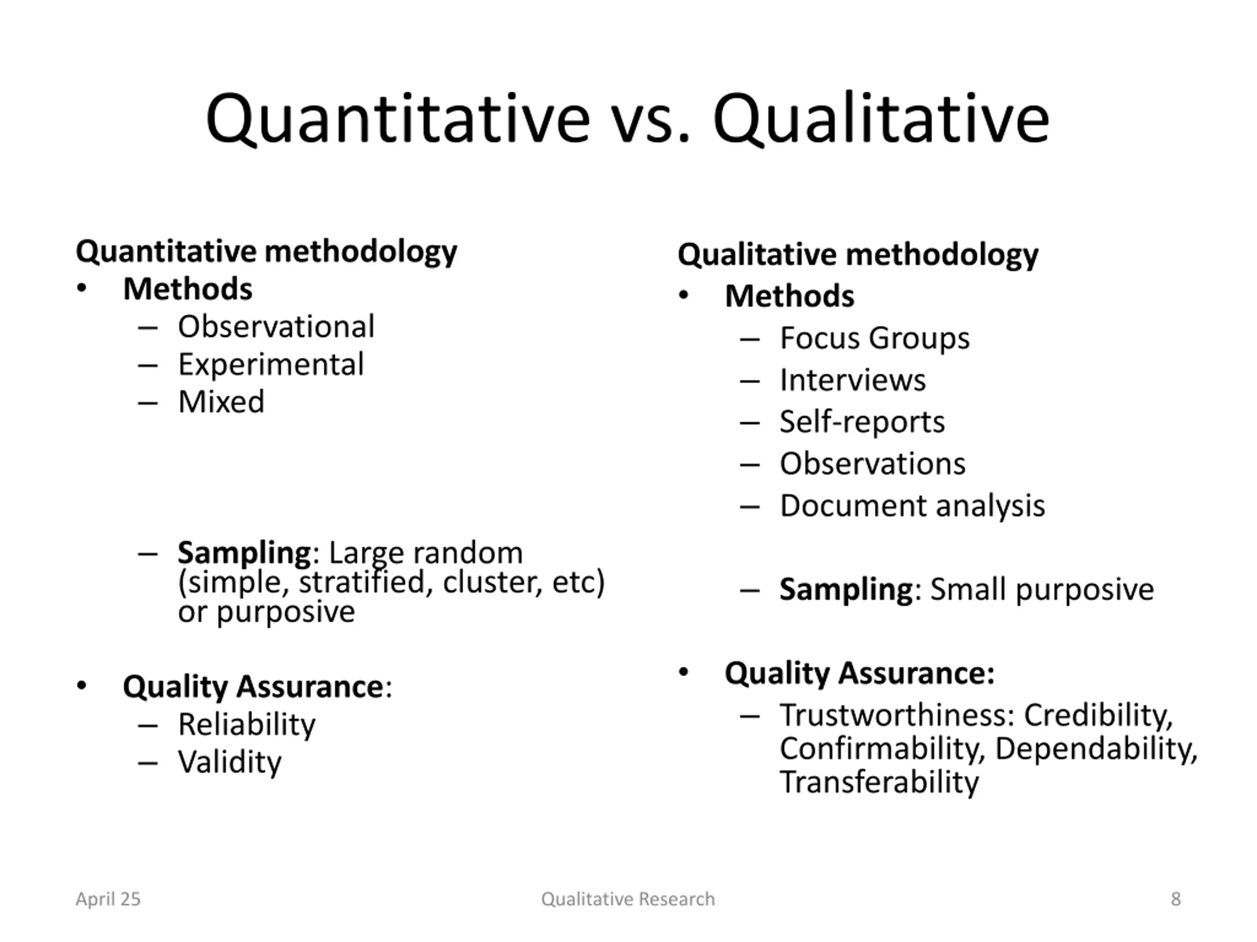 Quantitative vs. Qualitative Methodology Quantitative Method Experiment Technique RCT April 25 Qualitative Research 9