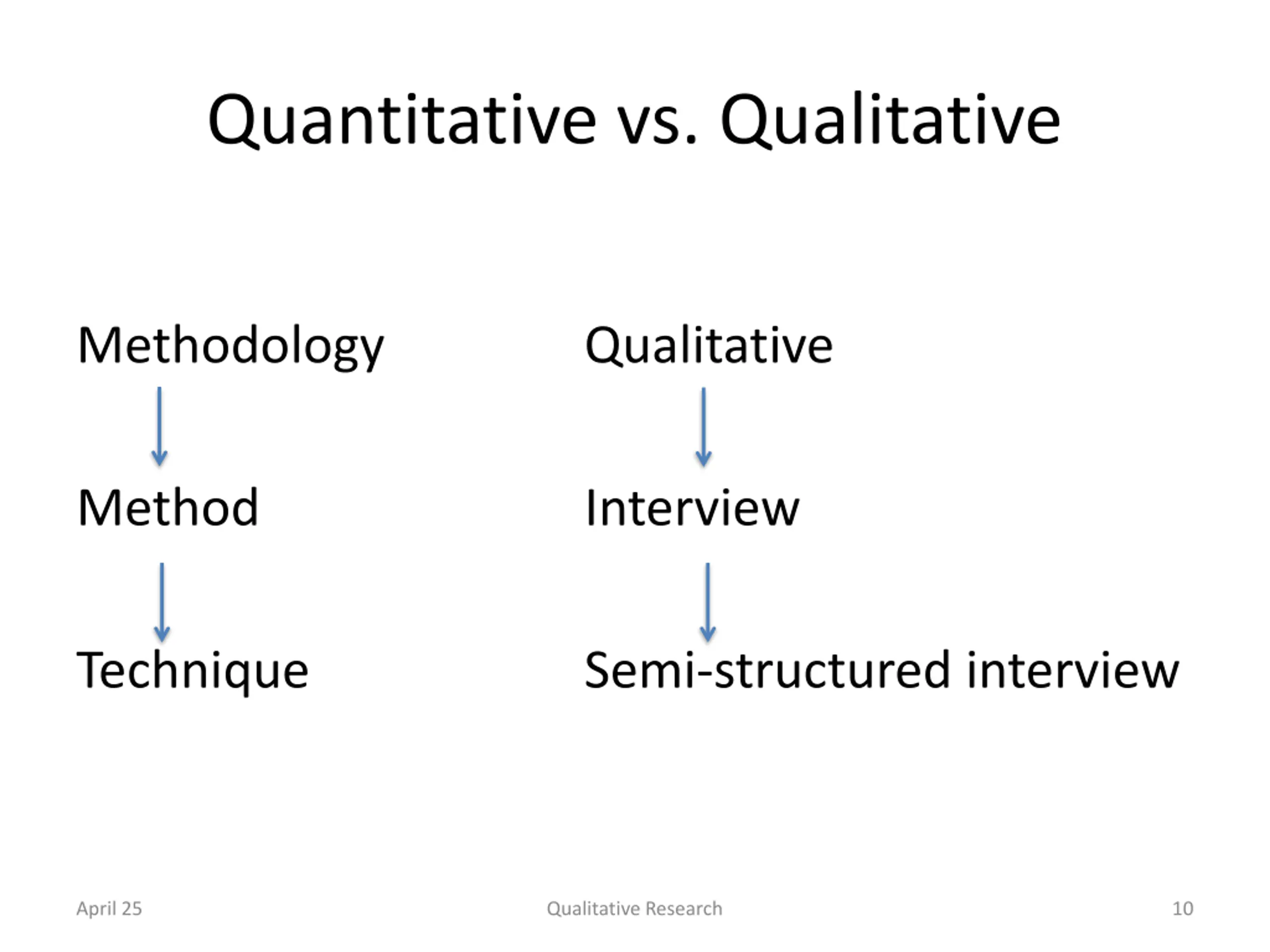 Quantitative vs. Qualitative Methodology Qualitative Method Interview Technique Semi-structured interview April 25 Qualitative Research 10