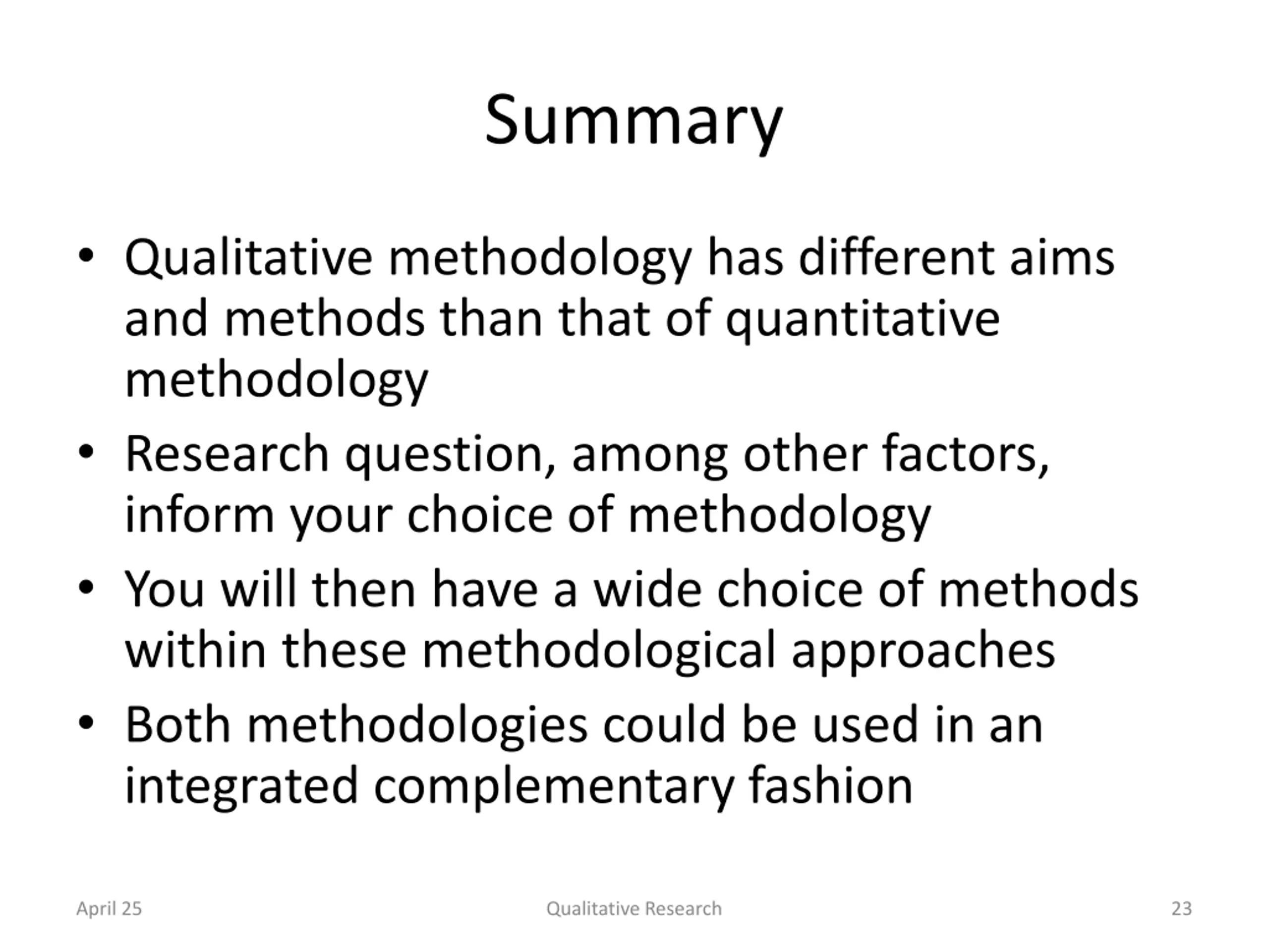 Summary Qualitative methodology has different aims and methods than that of quantitative methodology Research question, among other factors, inform your choice of methodology You will then have a wide choice of methods within these methodological approaches Both methodologies could be used in an integrated complementary fashion April 25 Qualitative Research 23