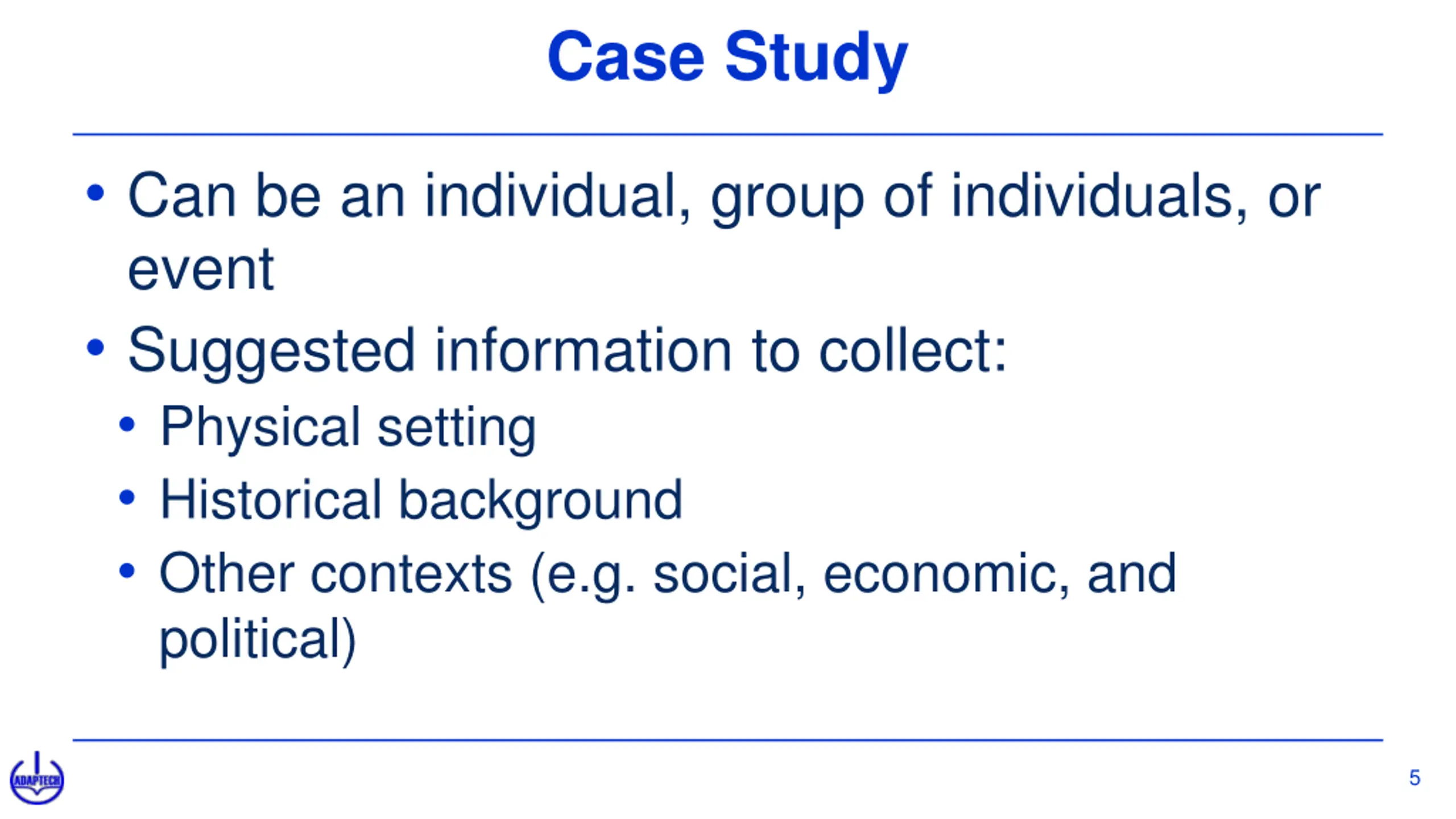 Case Study Can be an individual, group of individuals, or event Suggested information to collect: Physical setting Historical background Other contexts (e.g. social, economic, and political) 5