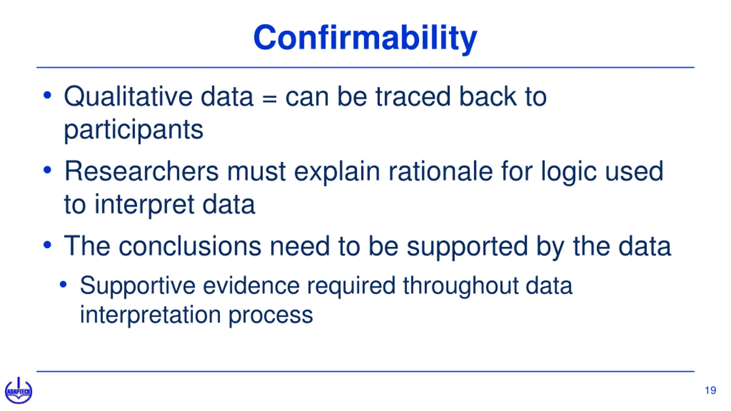 Confirmability Qualitative data = can be traced back to participants Researchers must explain rationale for logic used to interpret data The conclusions need to be supported by the data Supportive evidence required throughout data interpretation process 19
