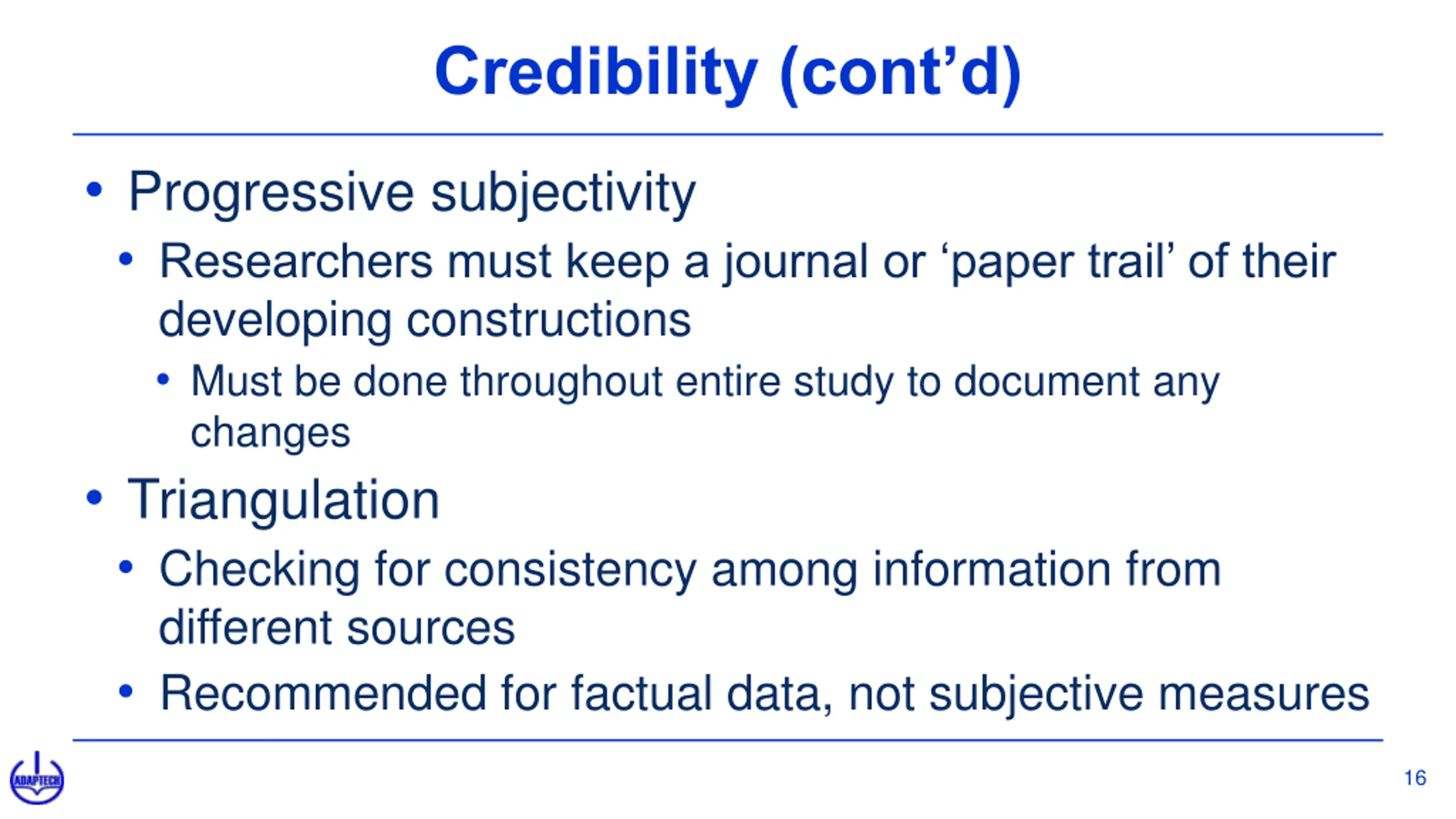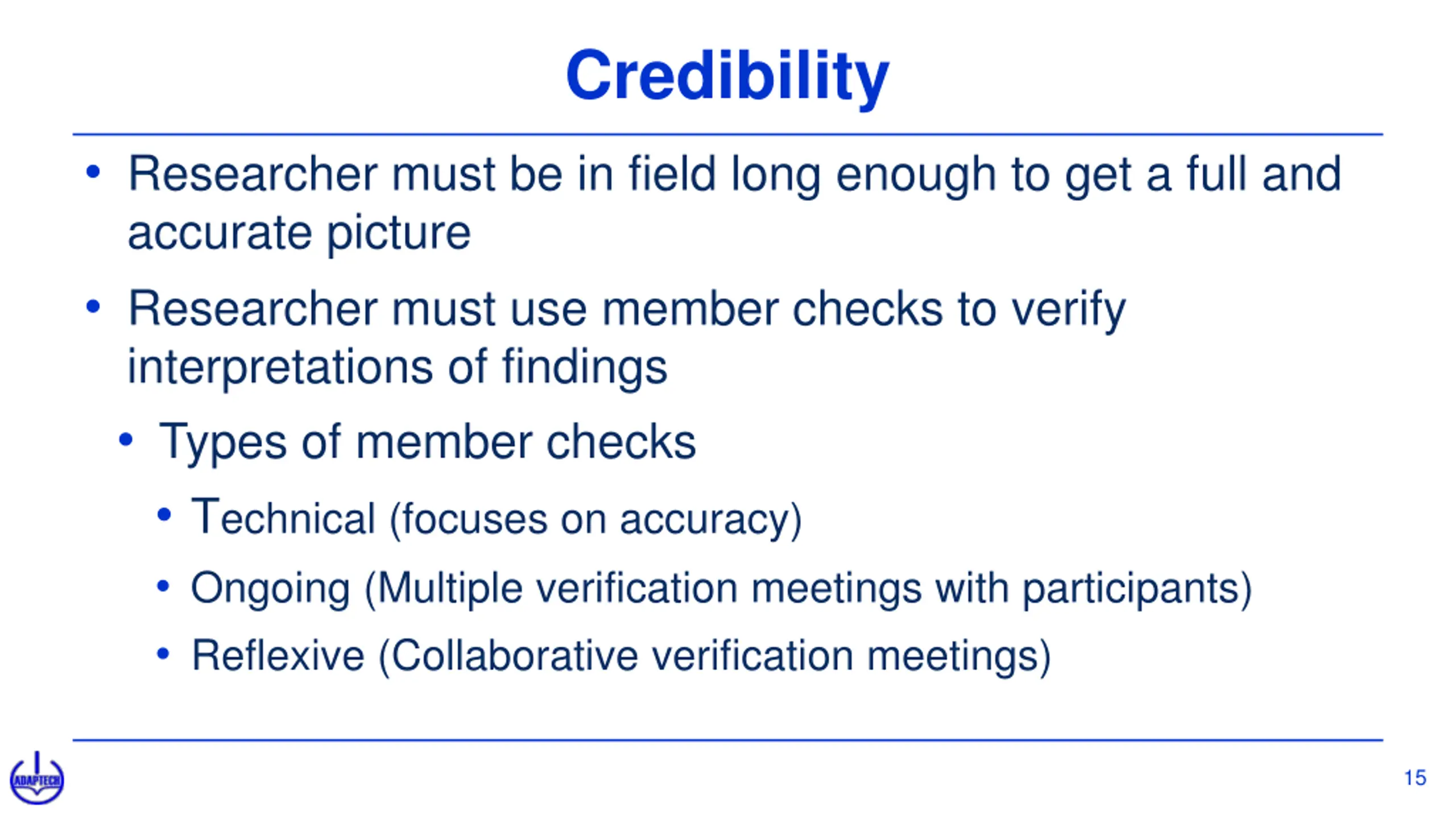 Credibility Researcher must be in field long enough to get a full and accurate picture Researcher must use member checks to verify interpretations of findings Types of member checks Technical (focuses on accuracy) Ongoing (Multiple verification meetings with participants) Reflexive (Collaborative verification meetings) 15