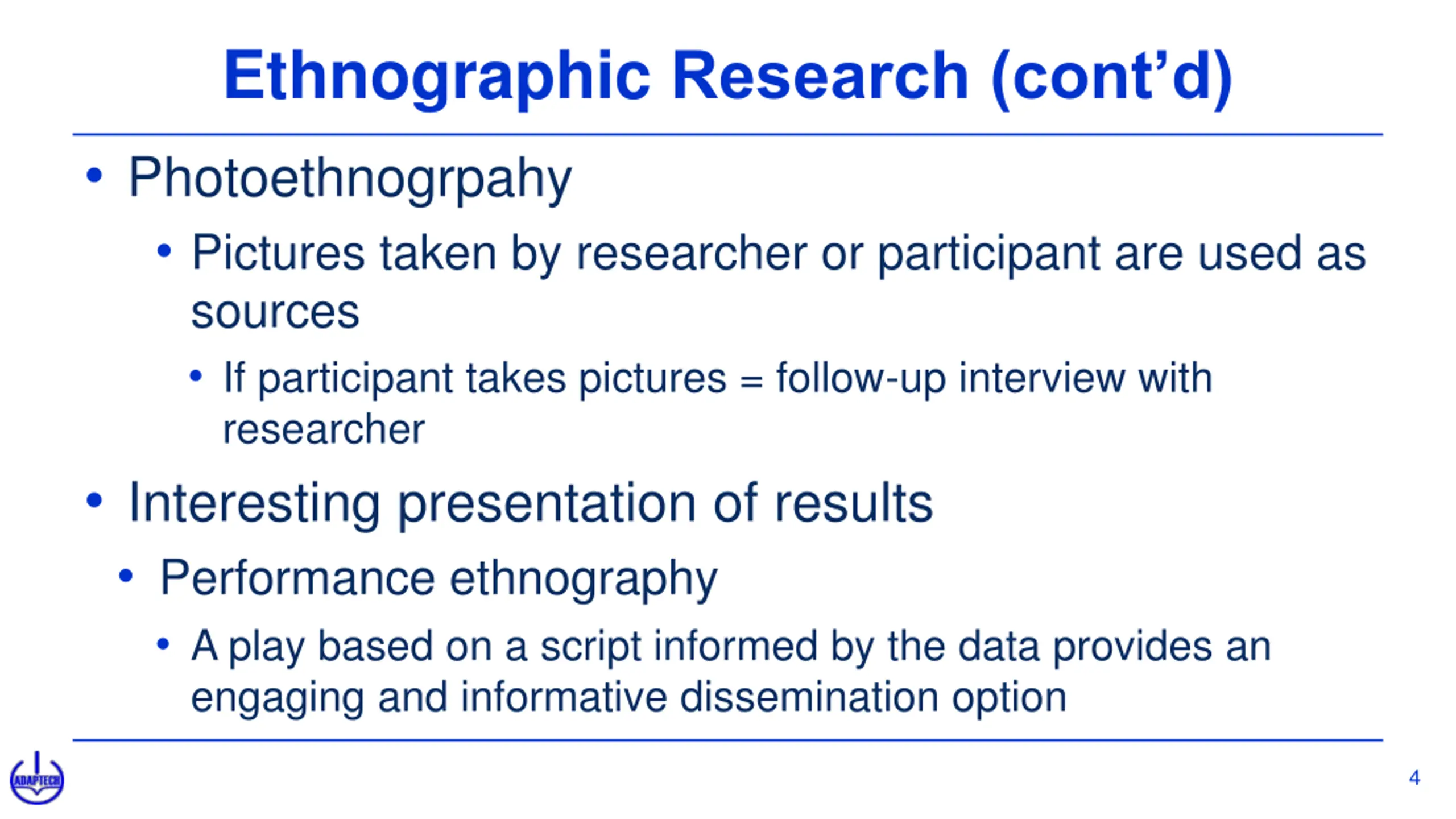 Ethnographic Research (contd) Photoethnogrpahy Pictures taken by researcher or participant are used as sources If participant takes pictures = follow-up interview with researcher Interesting presentation of results Performance ethnography A play based on a script informed by the data provides an engaging and informative dissemination option 4