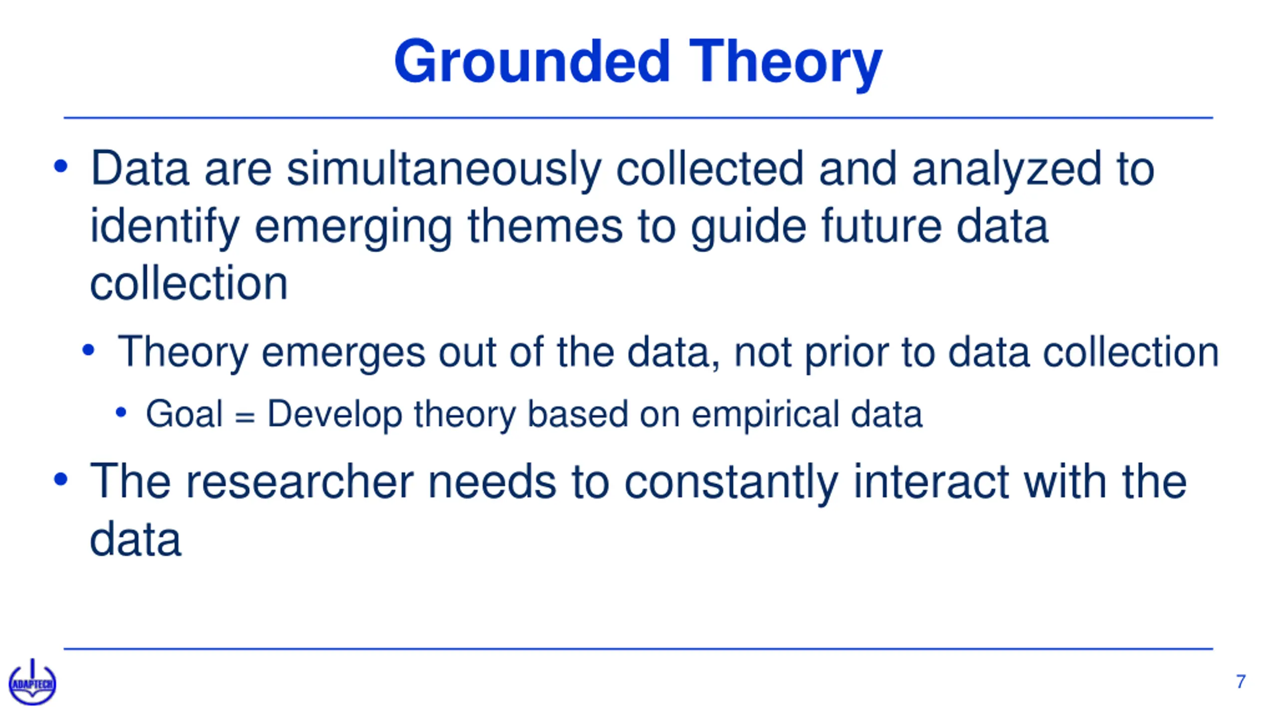 Grounded Theory Data are simultaneously collected and analyzed to identify emerging themes to guide future data collection Theory emerges out of the data, not prior to data collection Goal = Develop theory based on empirical data The researcher needs to constantly interact with the data 7