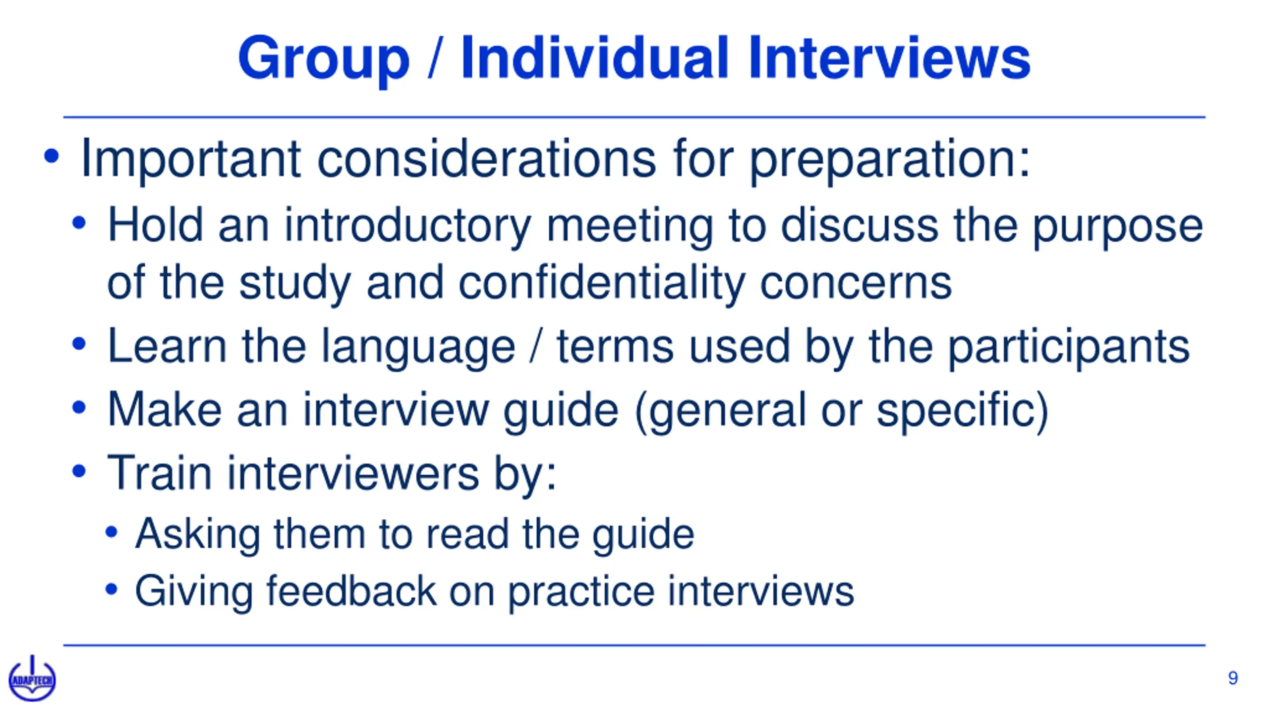 Group / Individual Interviews Important considerations for preparation: Hold an introductory meeting to discuss the purpose of the study and confidentiality concerns Learn the language / terms used by the participants Make an interview guide (general or specific) Train interviewers by: Asking them to read the guide Giving feedback on practice interviews 9