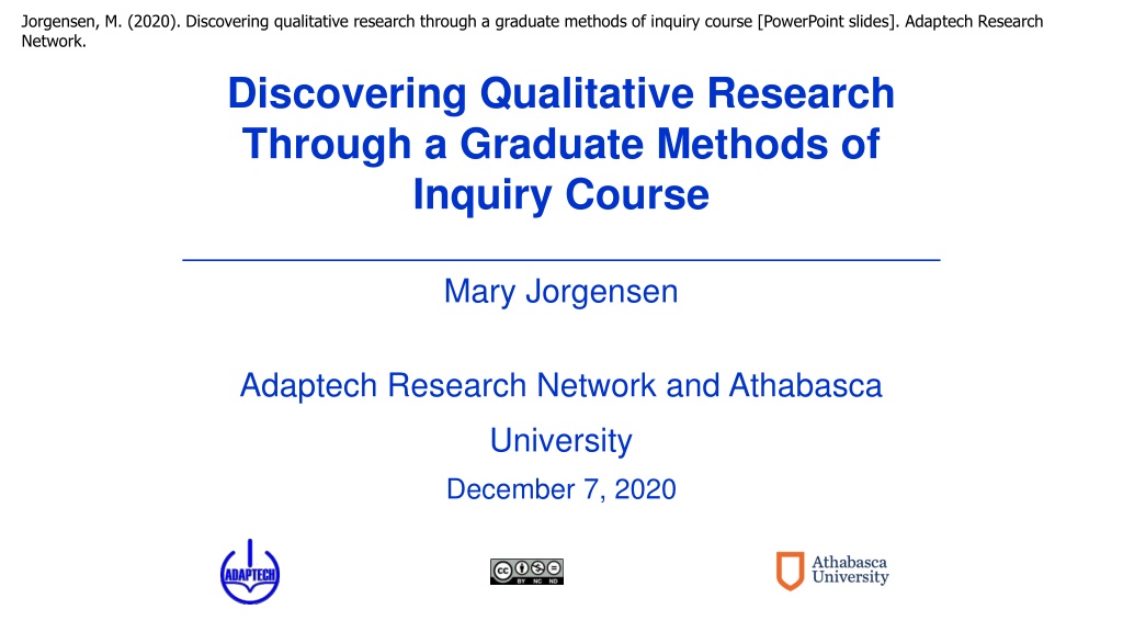 Jorgensen, M. (2020). Discovering qualitative research through a graduate methods of inquiry course [PowerPoint slides]. Adaptech Research Network. Discovering Qualitative Research Through a Graduate Methods of Inquiry Course Mary Jorgensen Adaptech Research Network and Athabasca University December 7, 2020