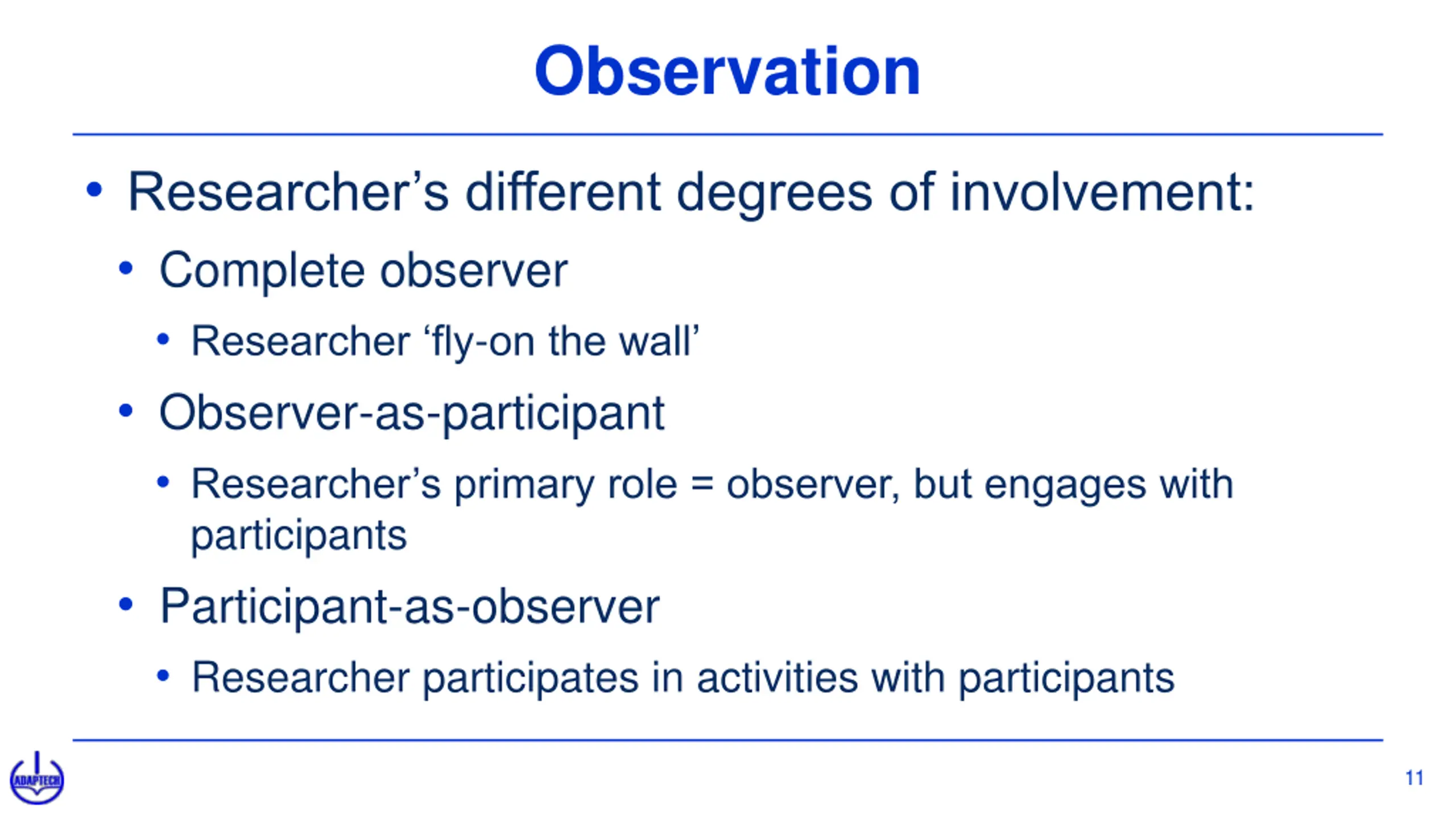 Observation Researcher s different degrees of involvement: Complete observer Researcher fly-on the wall Observer-as-participant Researcher s primary role = observer, but engages with participants Participant-as-observer Researcher participates in activities with participants 11