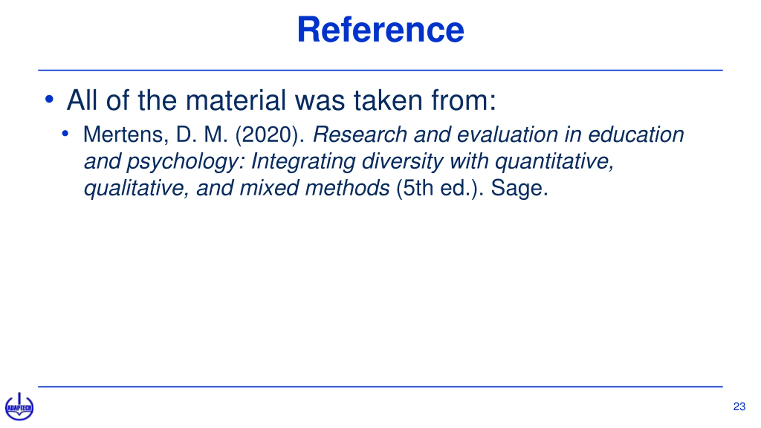 Reference All of the material was taken from: Mertens, D. M. (2020). Research and evaluation in education and psychology: Integrating diversity with quantitative, qualitative, and mixed methods (5th ed.). Sage. 23