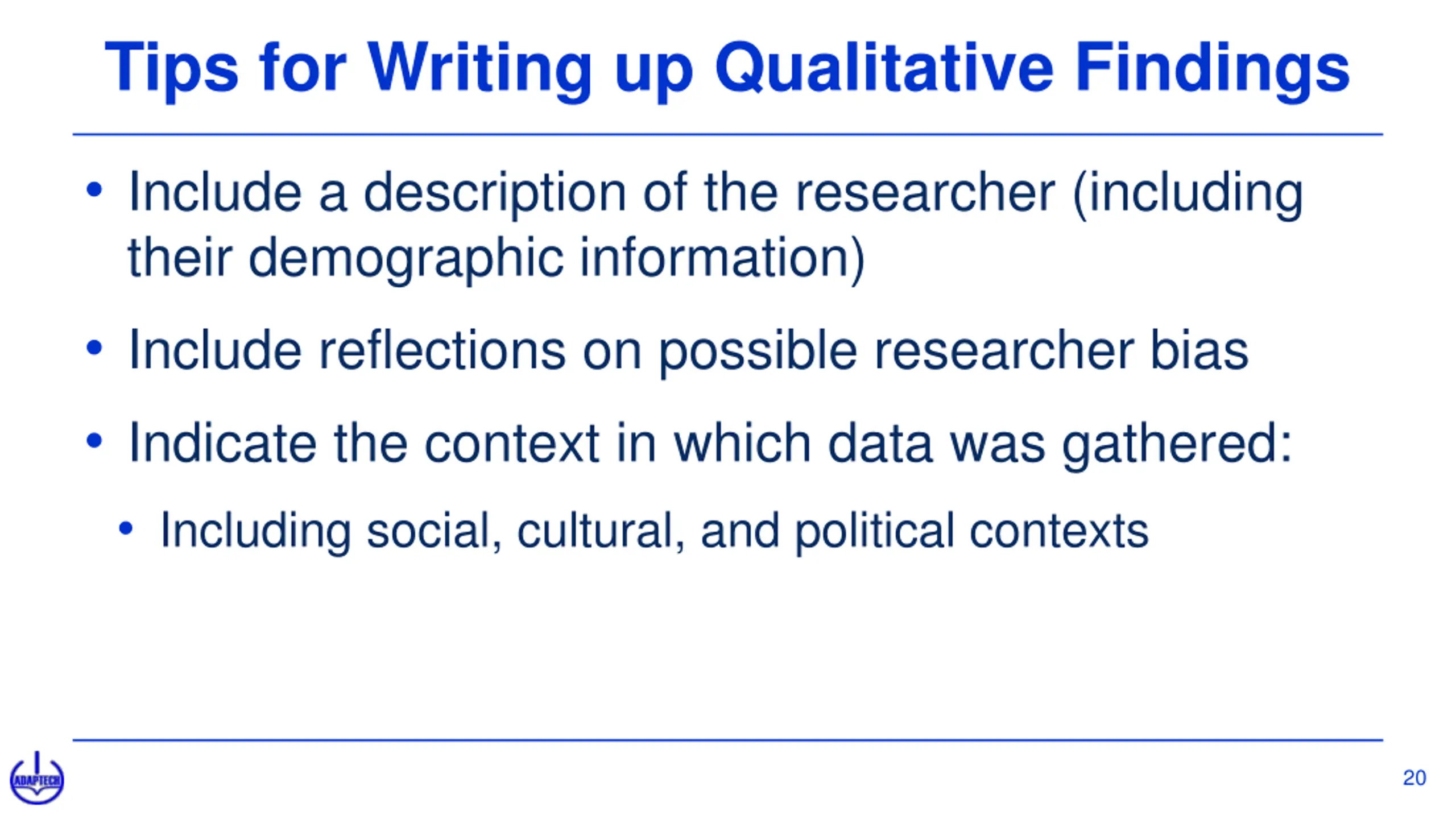 Tips for Writing up Qualitative Findings Include a description of the researcher (including their demographic information) Include reflections on possible researcher bias Indicate the context in which data was gathered: Including social, cultural, and political contexts 20