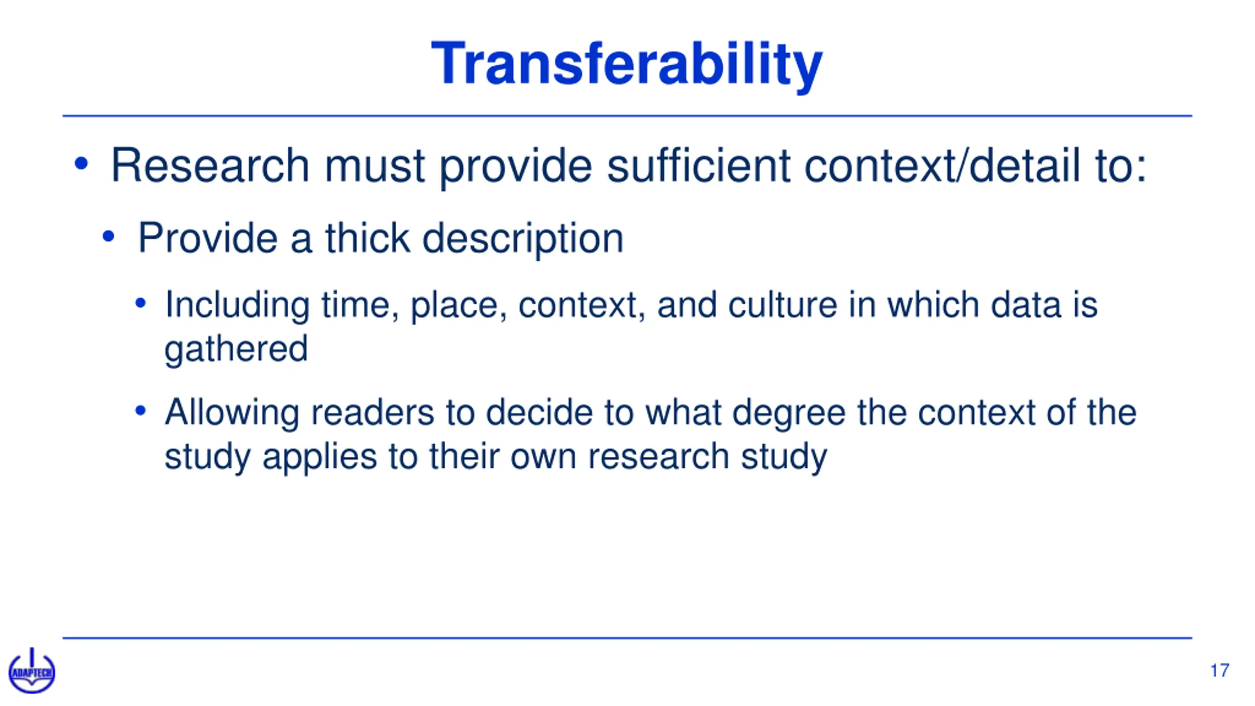 Transferability Research must provide sufficient context/detail to: Provide a thick description Including time, place, context, and culture in which data is gathered Allowing readers to decide to what degree the context of the study applies to their own research study 17