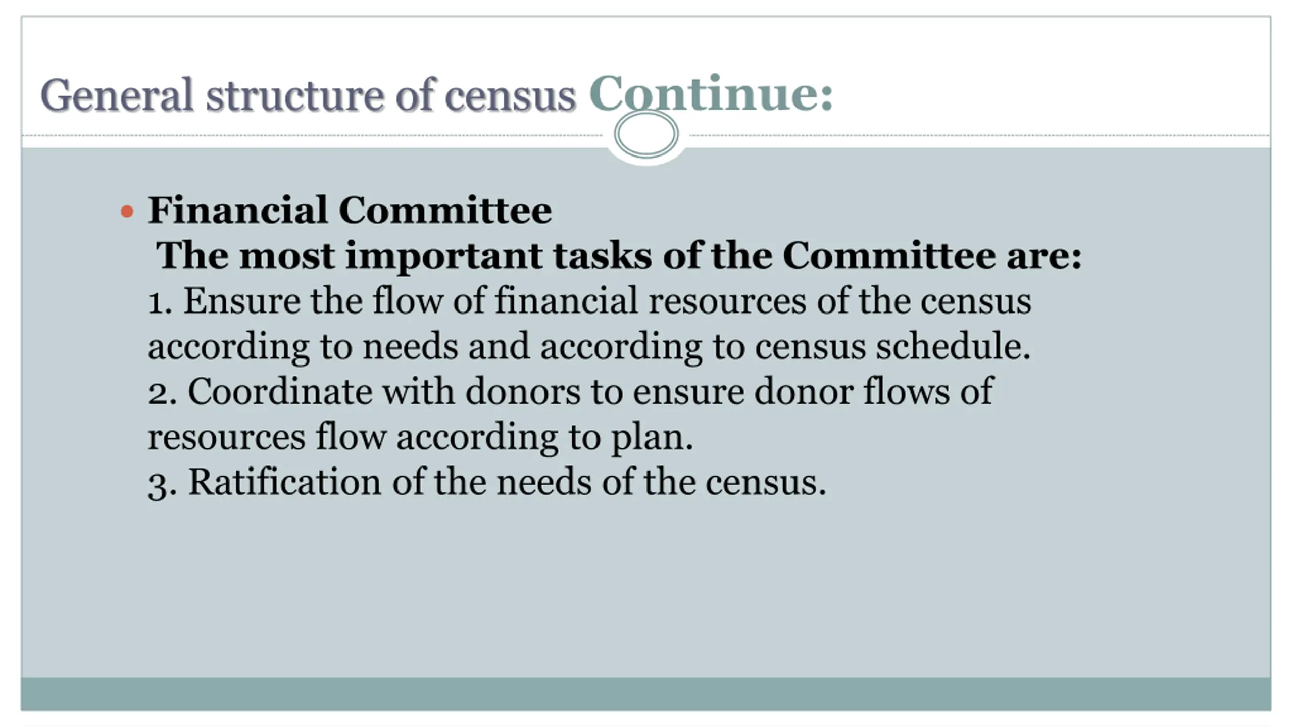 General structure of census Continue: Financial Committee The most important tasks of the Committee are: 1. Ensure the flow of financial resources of the census according to needs and according to census schedule. 2. Coordinate with donors to ensure donor flows of resources flow according to plan. 3. Ratification of the needs of the census.