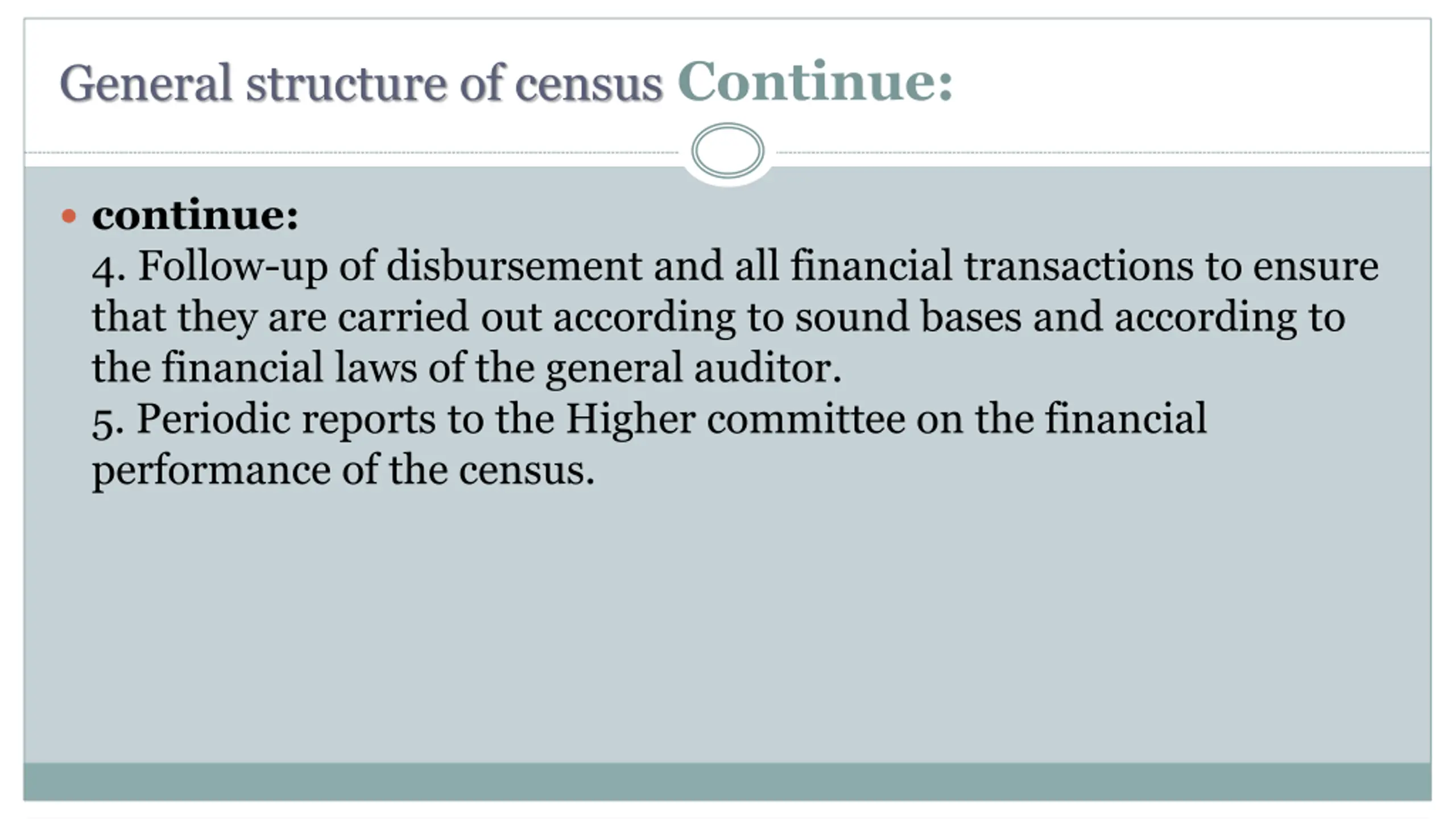 General structure of census Continue: continue: 4. Follow-up of disbursement and all financial transactions to ensure that they are carried out according to sound bases and according to the financial laws of the general auditor. 5. Periodic reports to the Higher committee on the financial performance of the census.
