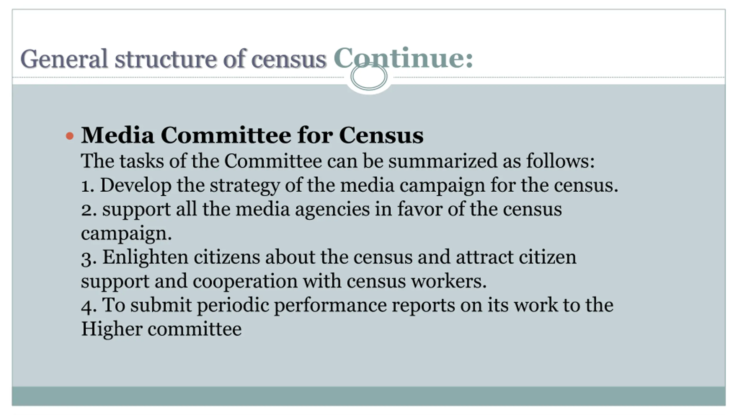 General structure of census Continue: Media Committee for Census The tasks of the Committee can be summarized as follows: 1. Develop the strategy of the media campaign for the census. 2. support all the media agencies in favor of the census campaign. 3. Enlighten citizens about the census and attract citizen support and cooperation with census workers. 4. To submit periodic performance reports on its work to the Higher committee