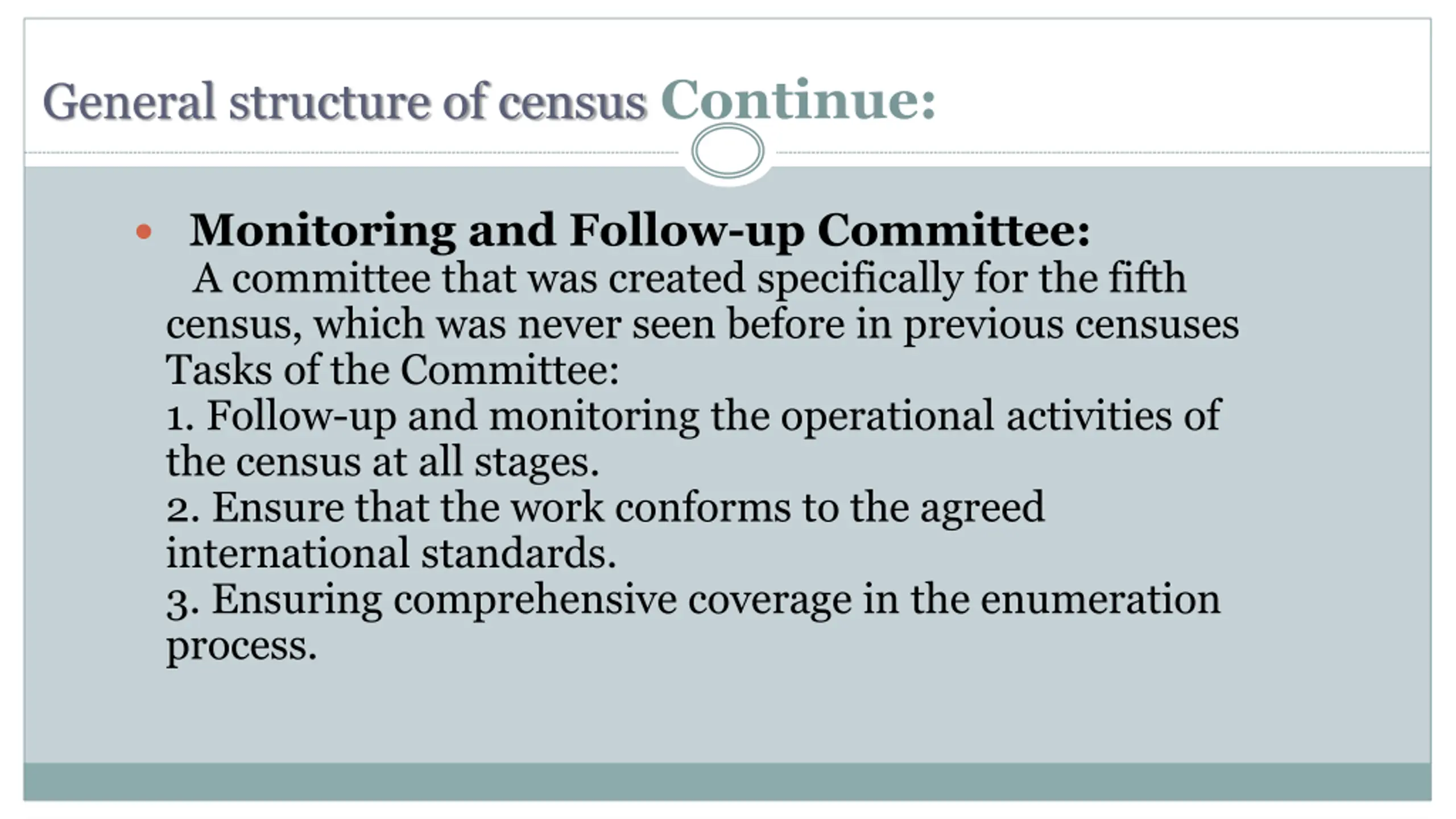 General structure of census Continue: Monitoring and Follow-up Committee: A committee that was created specifically for the fifth census, which was never seen before in previous censuses Tasks of the Committee: 1. Follow-up and monitoring the operational activities of the census at all stages. 2. Ensure that the work conforms to the agreed international standards. 3. Ensuring comprehensive coverage in the enumeration process.
