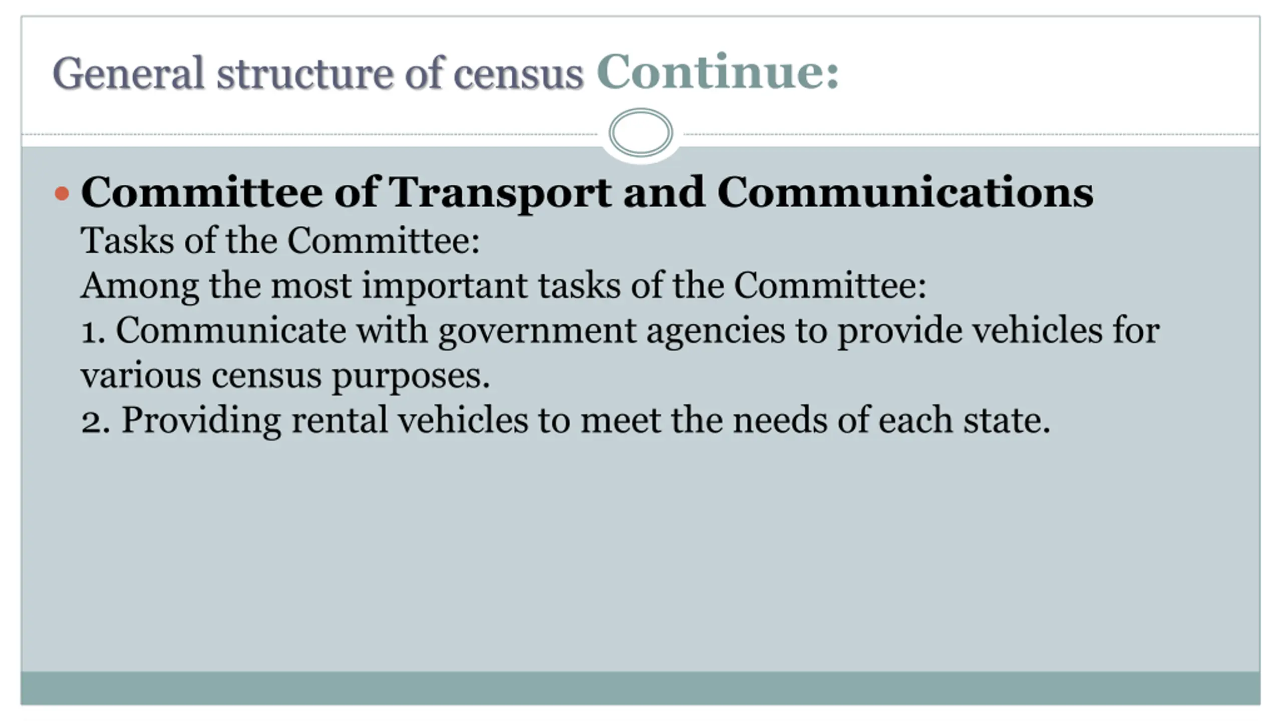General structure of census Continue: Committee of Transport and Communications Tasks of the Committee: Among the most important tasks of the Committee: 1. Communicate with government agencies to provide vehicles for various census purposes. 2. Providing rental vehicles to meet the needs of each state.