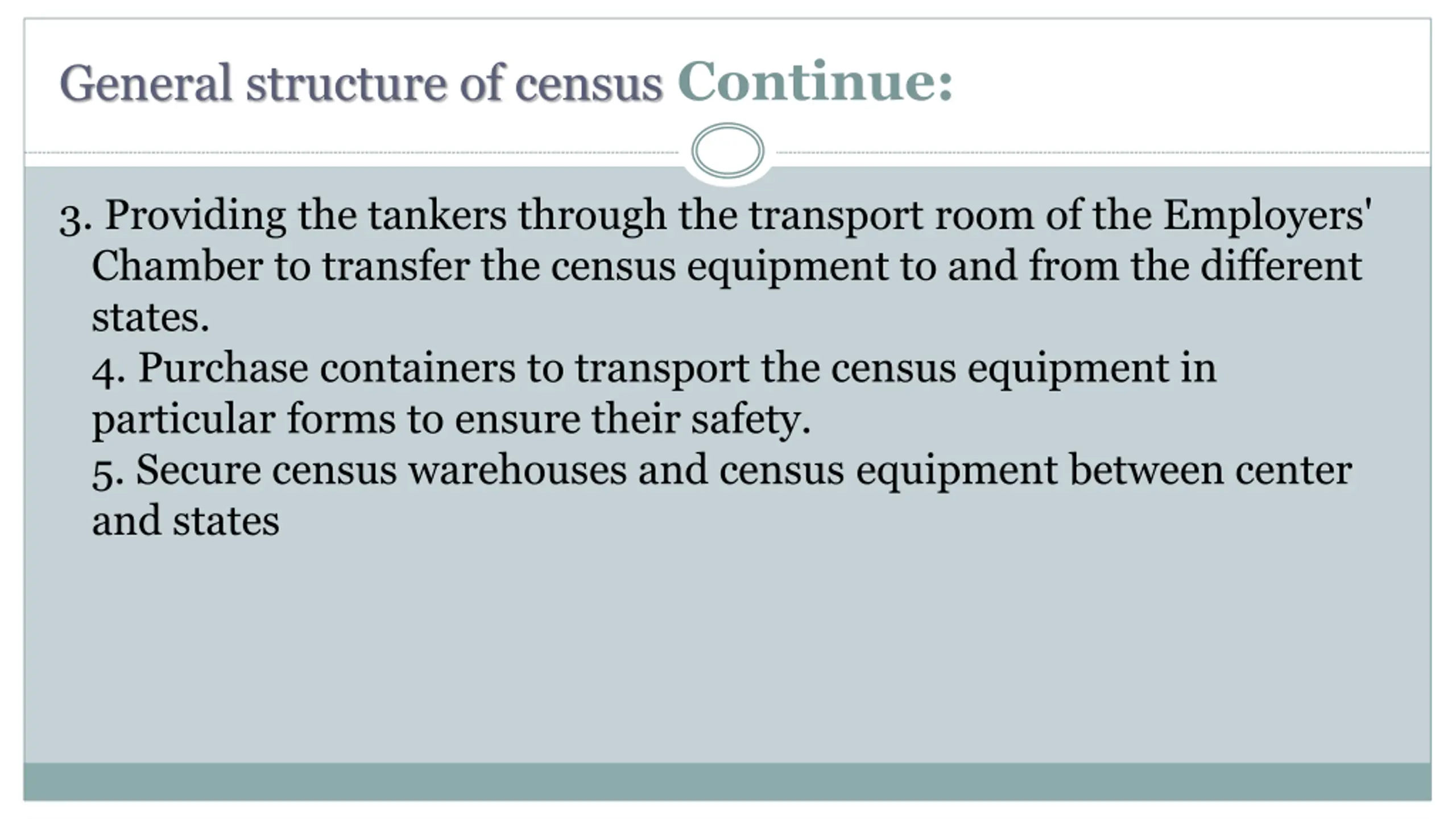 General structure of census Continue: 3. Providing the tankers through the transport room of the Employers' Chamber to transfer the census equipment to and from the different states. 4. Purchase containers to transport the census equipment in particular forms to ensure their safety. 5. Secure census warehouses and census equipment between center and states
