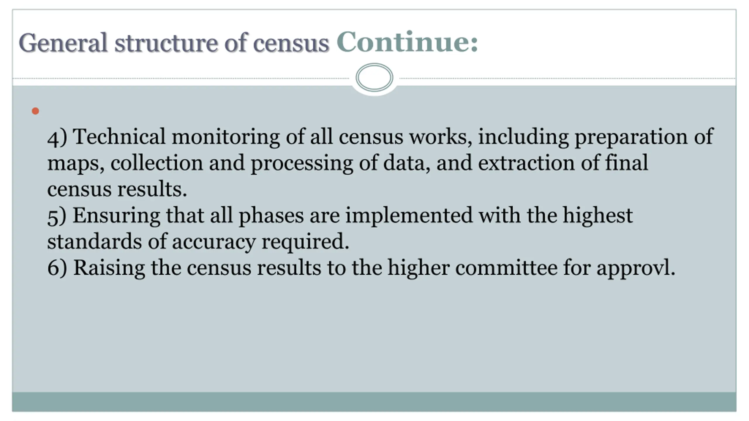 General structure of census Continue: 4) Technical monitoring of all census works, including preparation of maps, collection and processing of data, and extraction of final census results. 5) Ensuring that all phases are implemented with the highest standards of accuracy required. 6) Raising the census results to the higher committee for approvl.