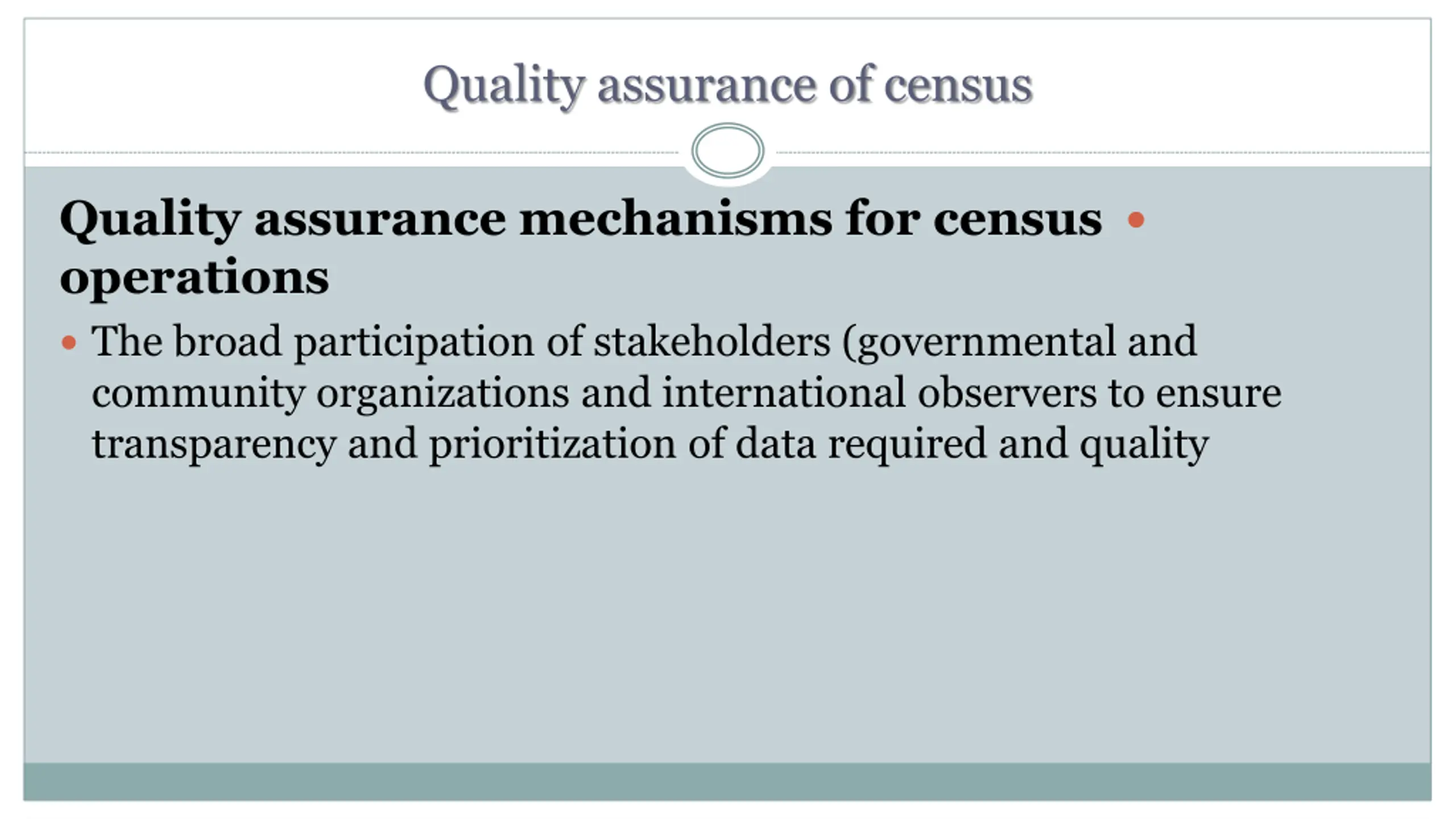 Quality assurance of census Quality assurance mechanisms for census operations The broad participation of stakeholders (governmental and community organizations and international observers to ensure transparency and prioritization of data required and quality