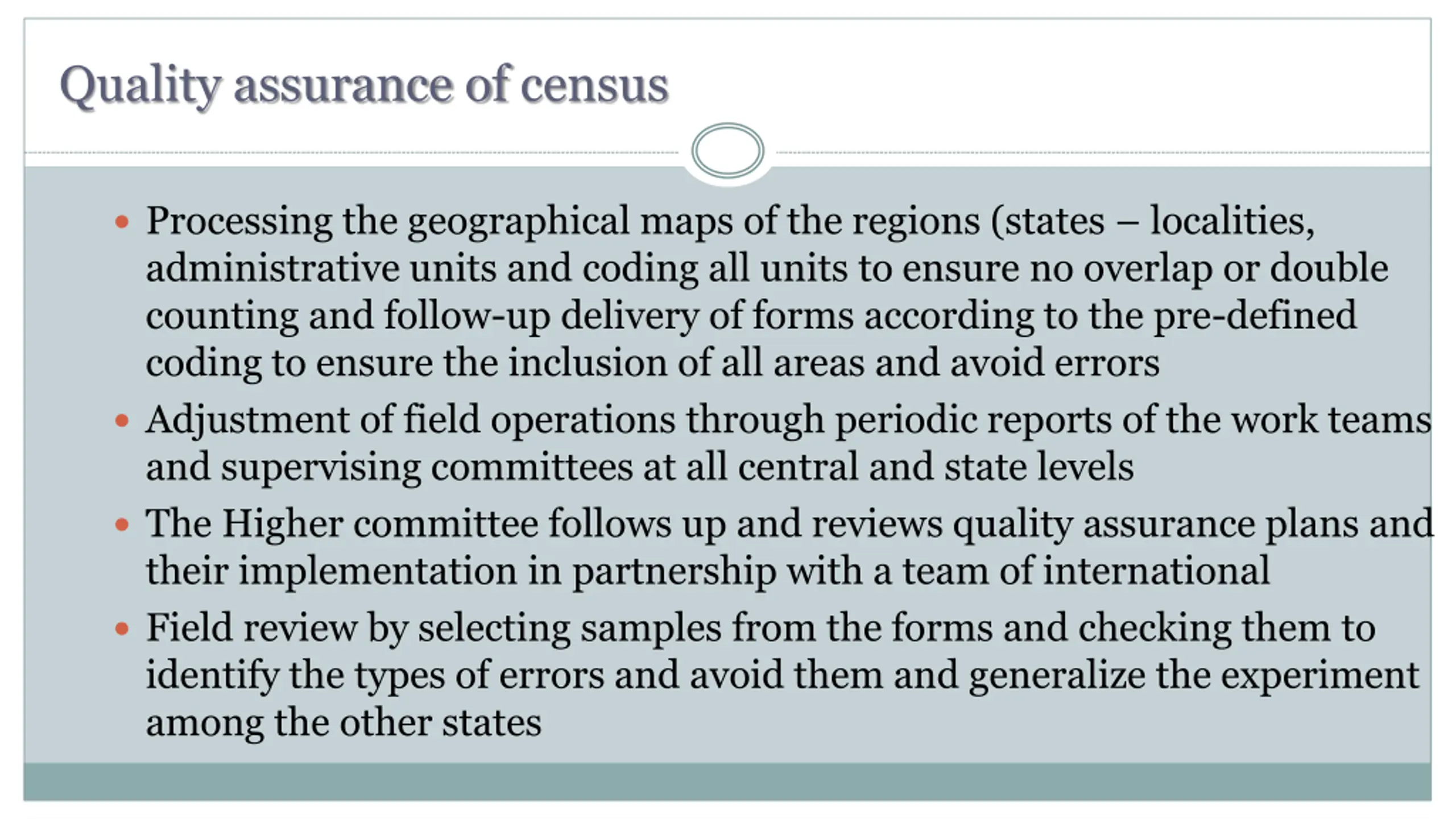 Quality assurance of census Processing the geographical maps of the regions (states localities, administrative units and coding all units to ensure no overlap or double counting and follow-up delivery of forms according to the pre-defined coding to ensure the inclusion of all areas and avoid errors Adjustment of field operations through periodic reports of the work teams and supervising committees at all central and state levels The Higher committee follows up and reviews quality assurance plans and their implementation in partnership with a team of international Field review by selecting samples from the forms and checking them to identify the types of errors and avoid them and generalize the experiment among the other states