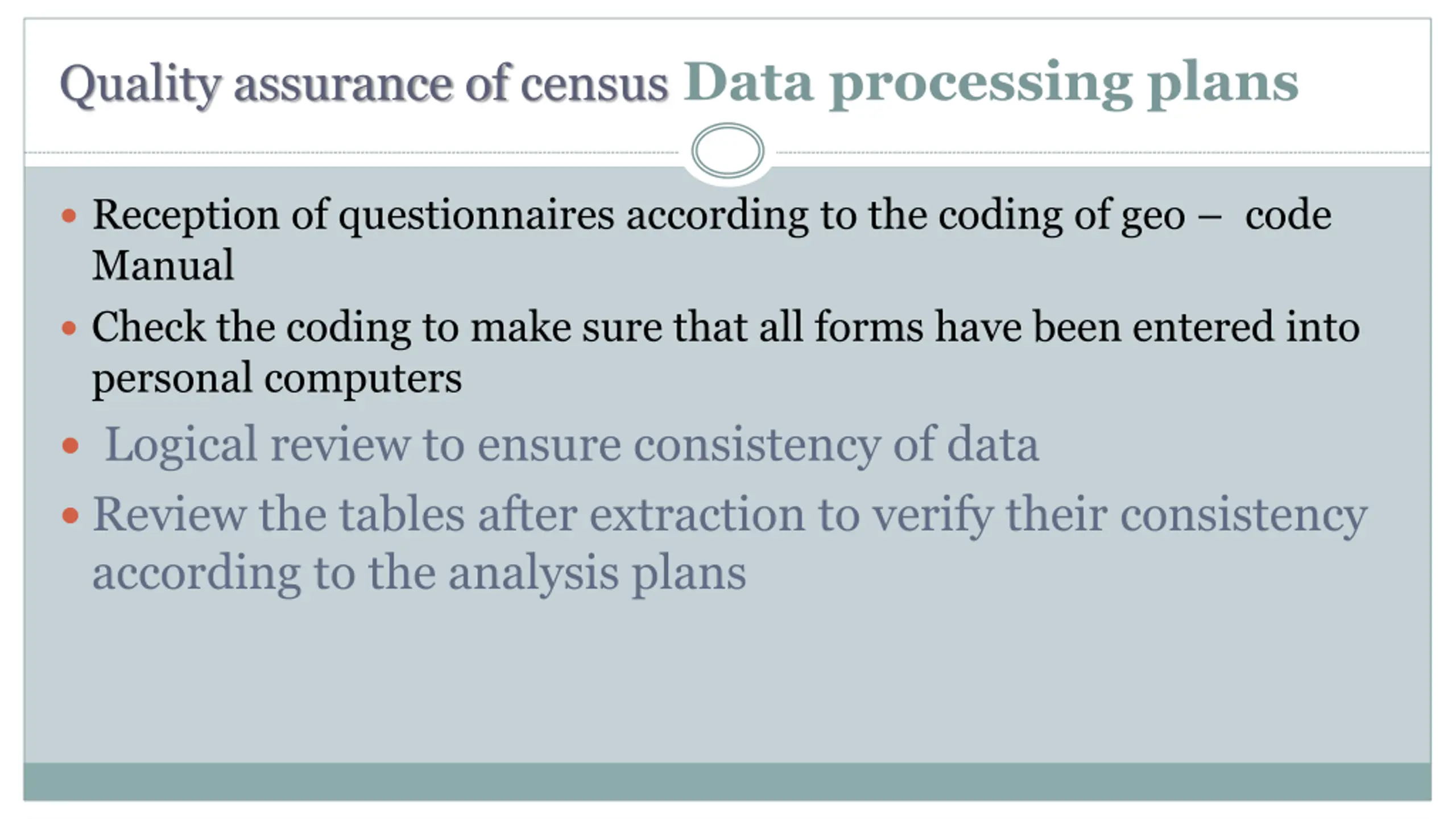 Quality assurance of census Data processing plans Reception of questionnaires according to the coding of geo code Manual Check the coding to make sure that all forms have been entered into personal computers Logical review to ensure consistency of data Review the tables after extraction to verify their consistency according to the analysis plans
