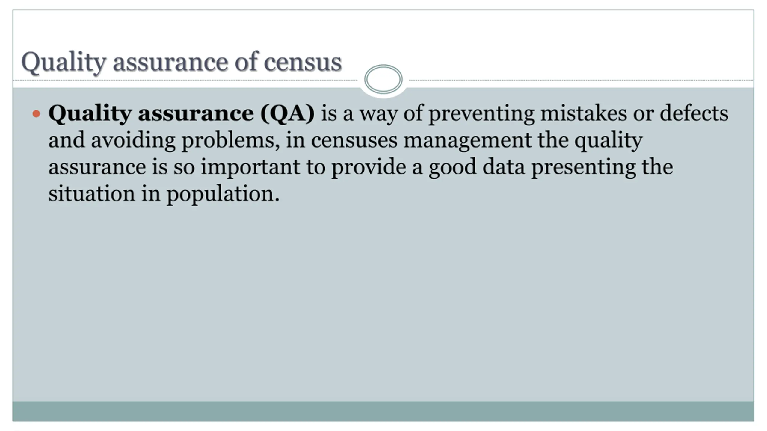 Quality assurance of census Quality assurance (QA) is a way of preventing mistakes or defects and avoiding problems, in censuses management the quality assurance is so important to provide a good data presenting the situation in population.