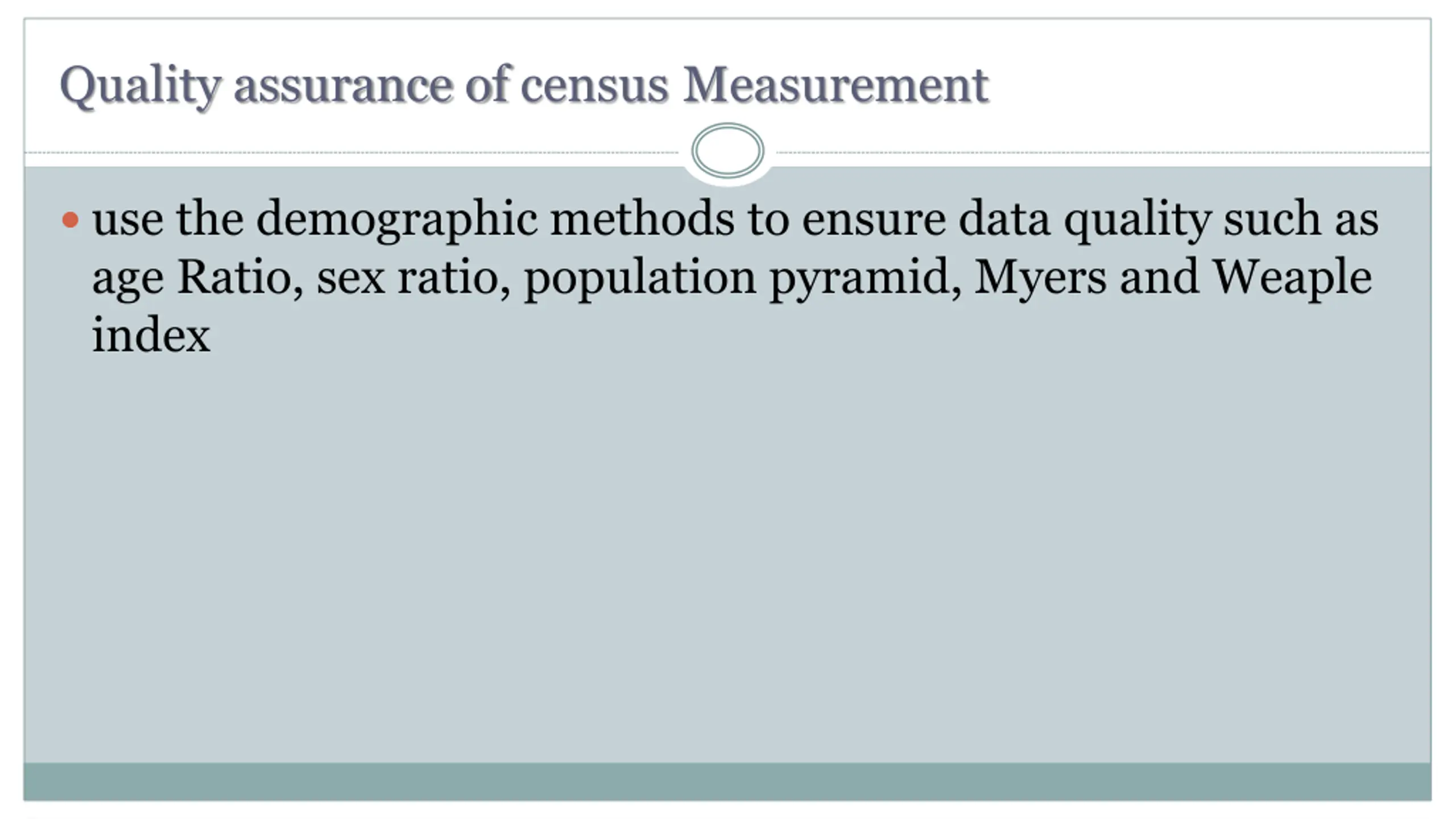 Quality assurance of census Measurement use the demographic methods to ensure data quality such as age Ratio, sex ratio, population pyramid, Myers and Weaple index