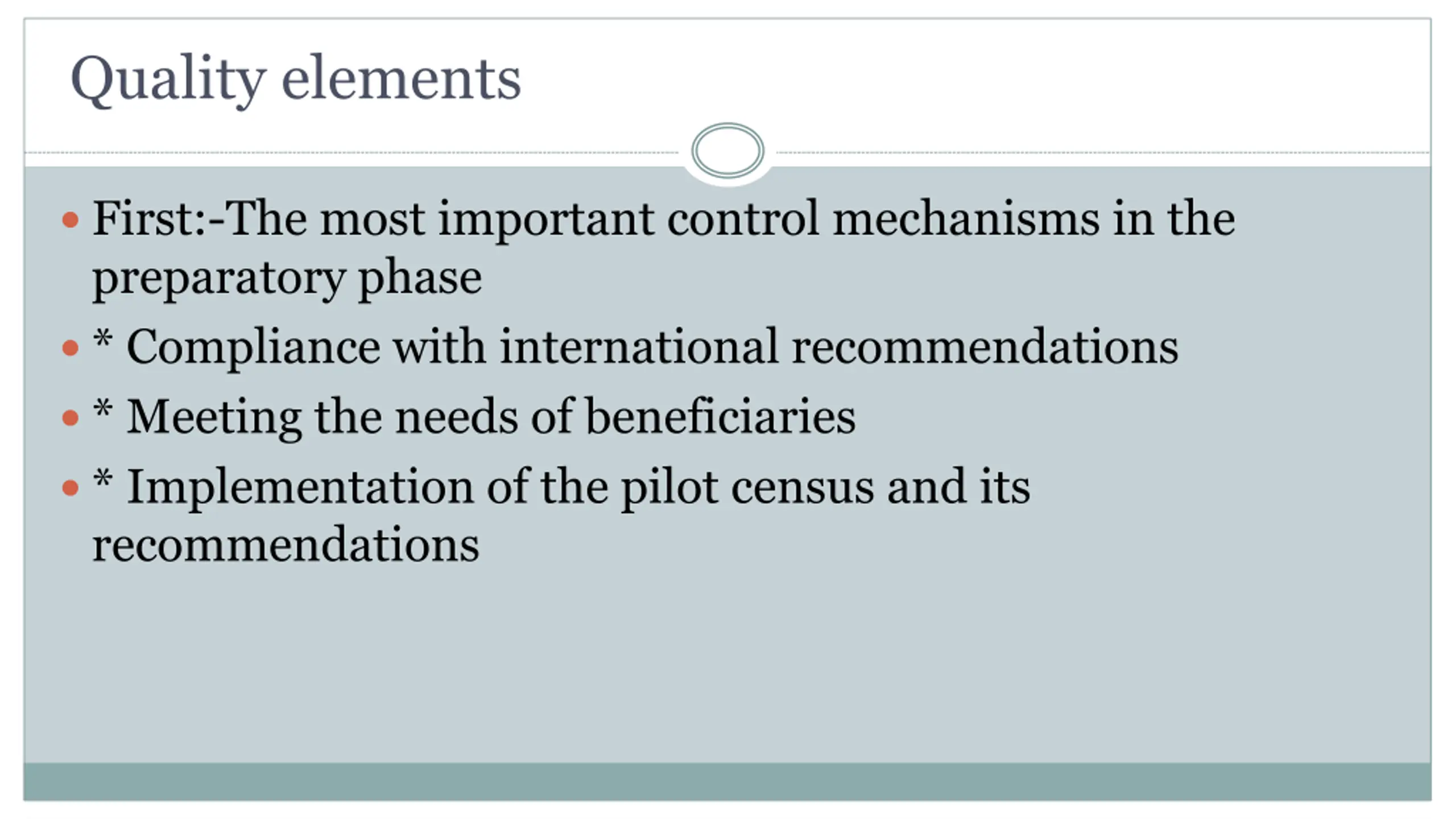 Quality elements First:-The most important control mechanisms in the preparatory phase * Compliance with international recommendations * Meeting the needs of beneficiaries * Implementation of the pilot census and its recommendations