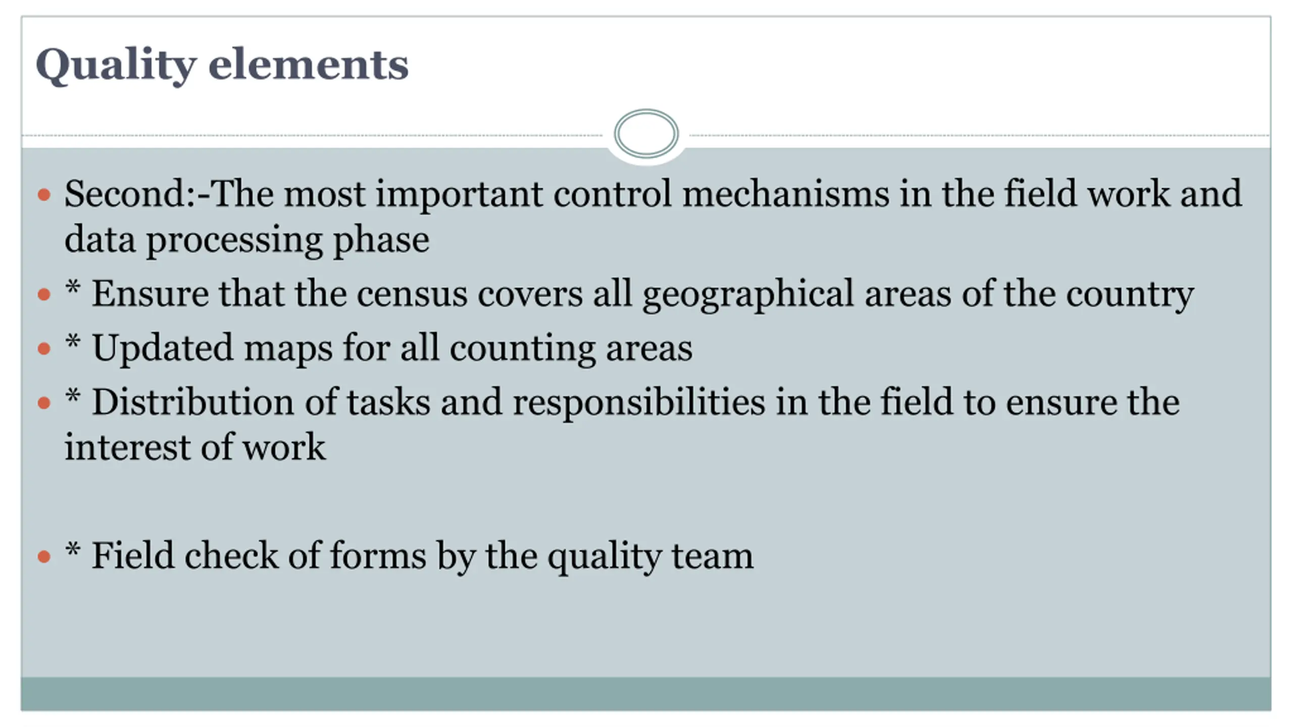 Quality elements Second:-The most important control mechanisms in the field work and data processing phase * Ensure that the census covers all geographical areas of the country * Updated maps for all counting areas * Distribution of tasks and responsibilities in the field to ensure the interest of work * Field check of forms by the quality team