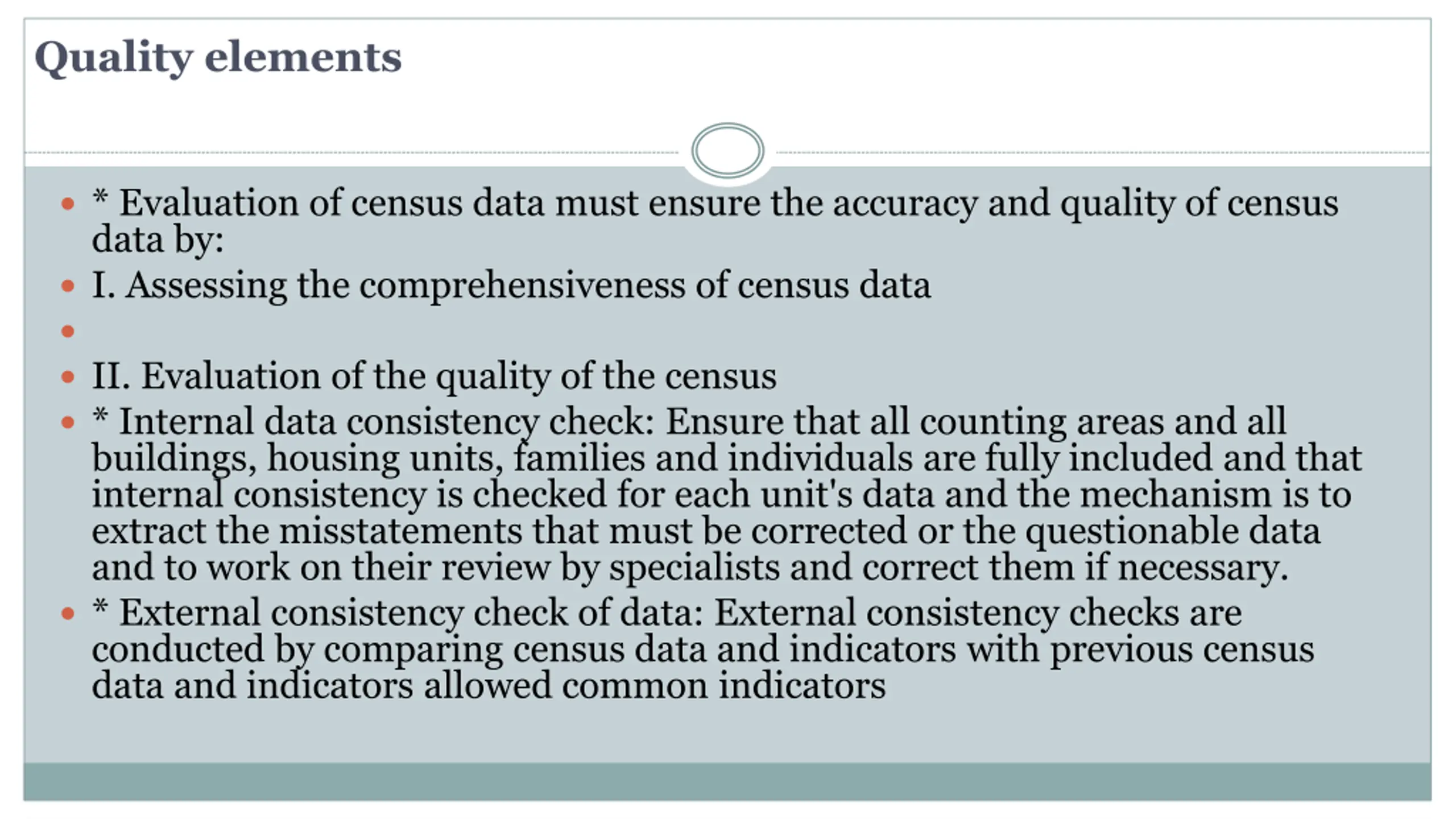 Quality elements * Evaluation of census data must ensure the accuracy and quality of census data by: I. Assessing the comprehensiveness of census data II. Evaluation of the quality of the census * Internal data consistency check: Ensure that all counting areas and all buildings, housing units, families and individuals are fully included and that internal consistency is checked for each unit's data and the mechanism is to extract the misstatements that must be corrected or the questionable data and to work on their review by specialists and correct them if necessary. * External consistency check of data: External consistency checks are conducted by comparing census data and indicators with previous census data and indicators allowed common indicators