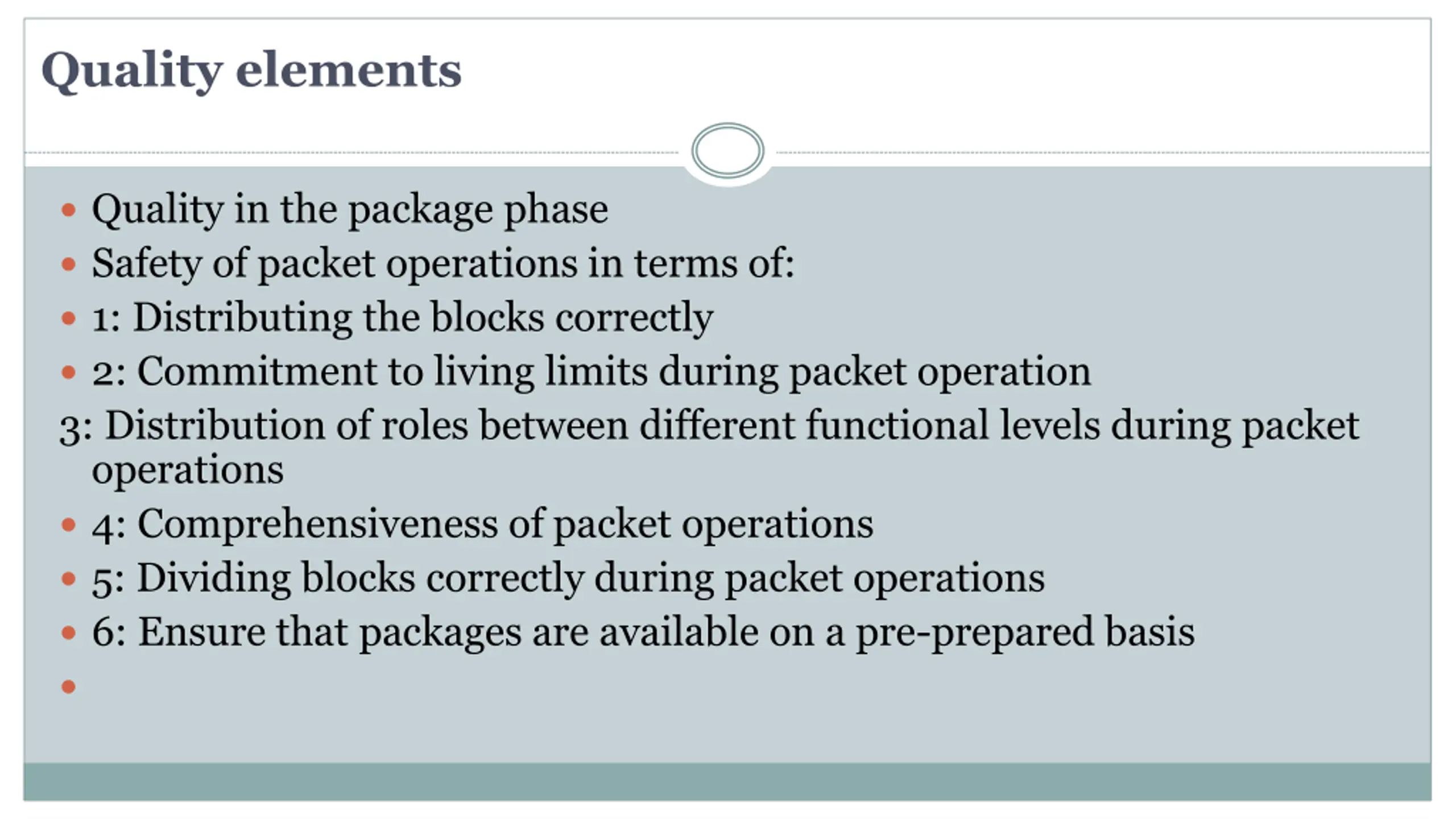 Quality elements Quality in the package phase Safety of packet operations in terms of: 1: Distributing the blocks correctly 2: Commitment to living limits during packet operation 3: Distribution of roles between different functional levels during packet operations 4: Comprehensiveness of packet operations 5: Dividing blocks correctly during packet operations 6: Ensure that packages are available on a pre-prepared basis