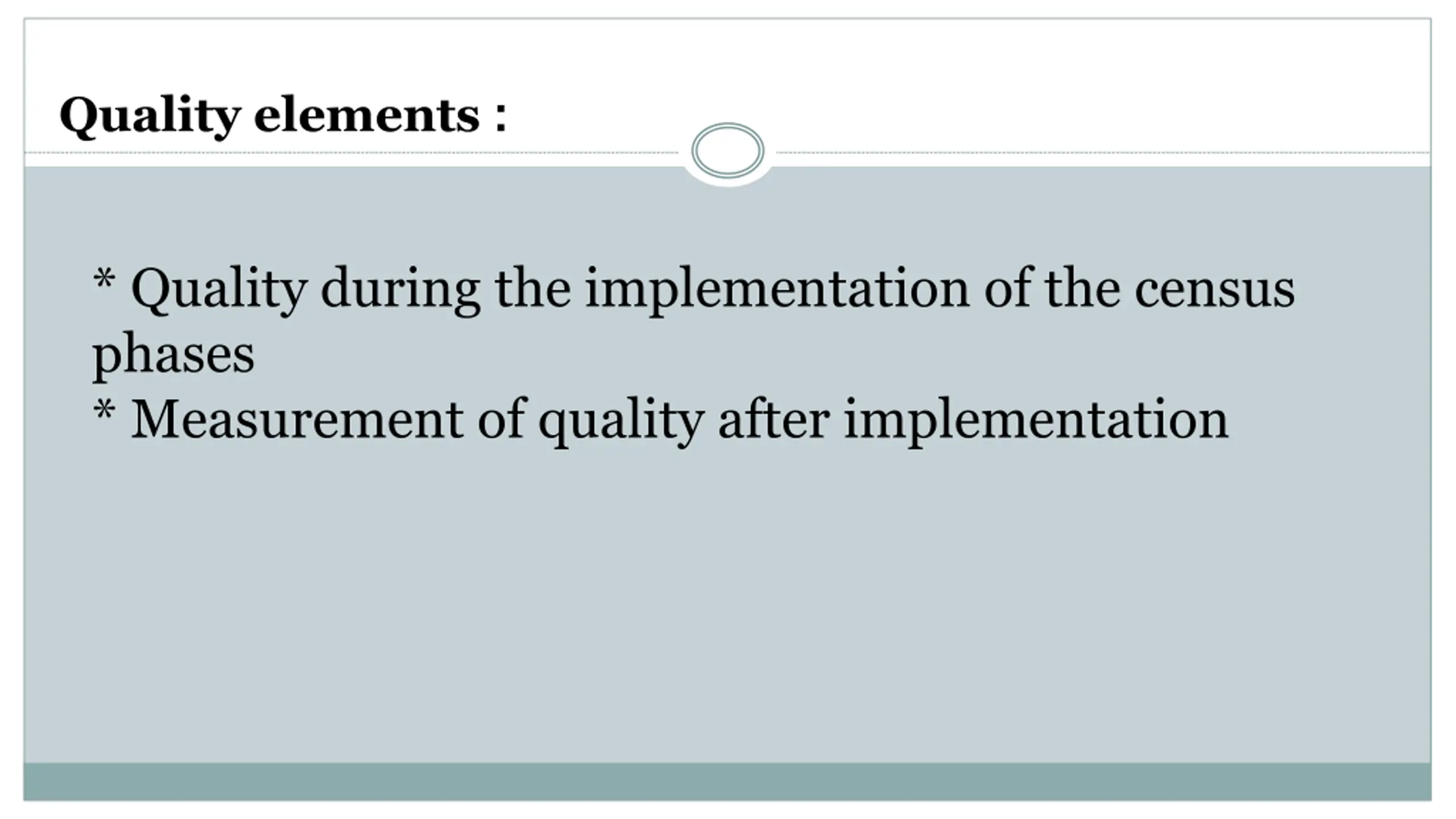 Quality elements : * Quality during the implementation of the census phases * Measurement of quality after implementation