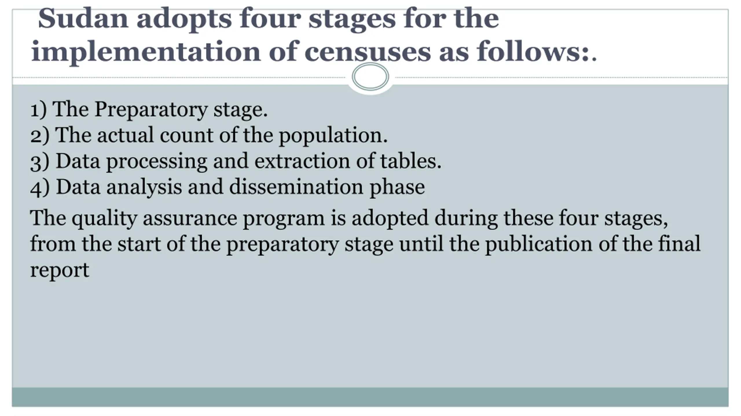 Sudan adopts four stages for the implementation of censuses as follows:. 1) The Preparatory stage. 2) The actual count of the population. 3) Data processing and extraction of tables. 4) Data analysis and dissemination phase The quality assurance program is adopted during these four stages, from the start of the preparatory stage until the publication of the final report