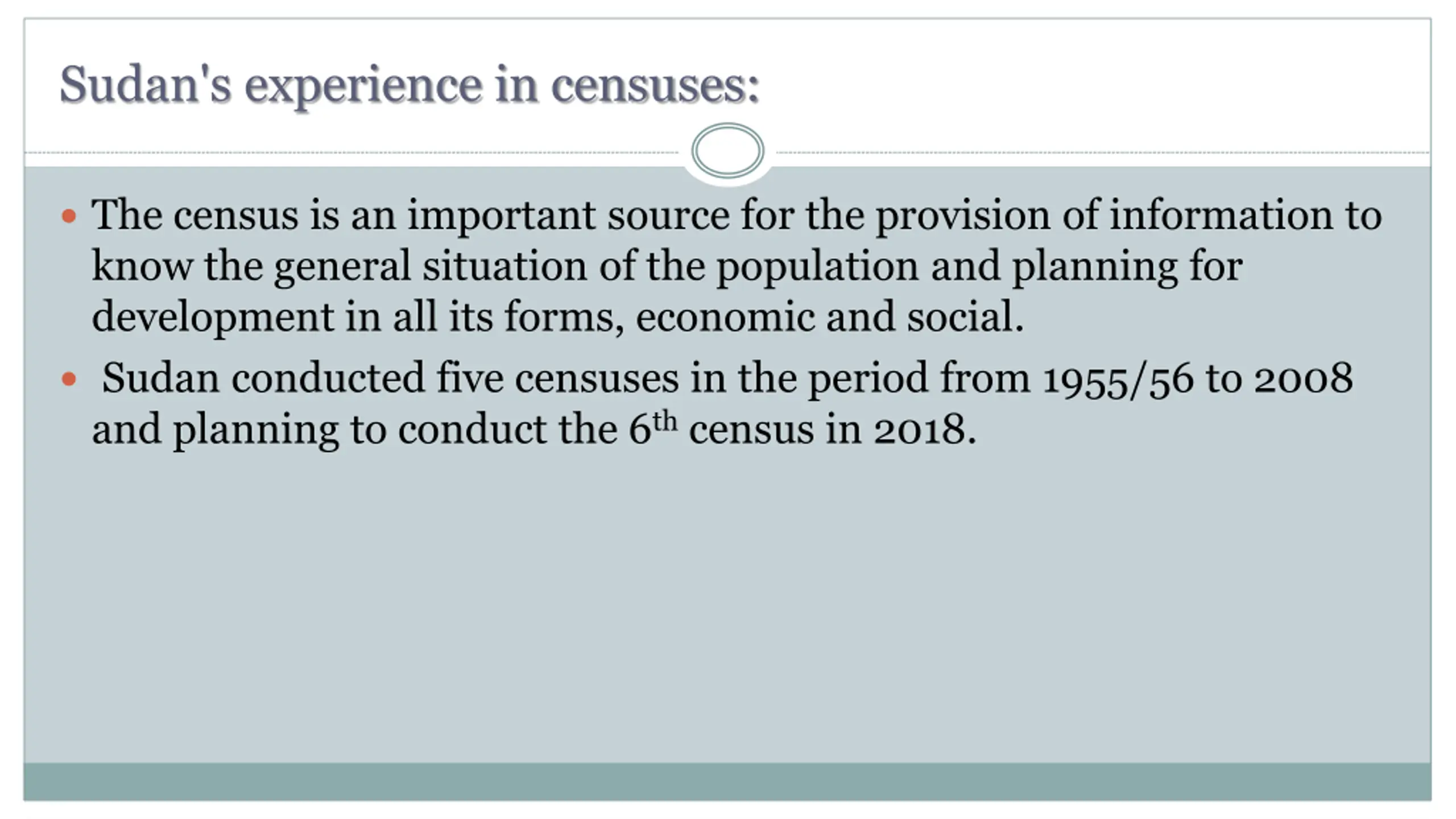 Sudan's experience in censuses: The census is an important source for the provision of information to know the general situation of the population and planning for development in all its forms, economic and social. Sudan conducted five censuses in the period from 1955/56 to 2008 and planning to conduct the 6th census in 2018.