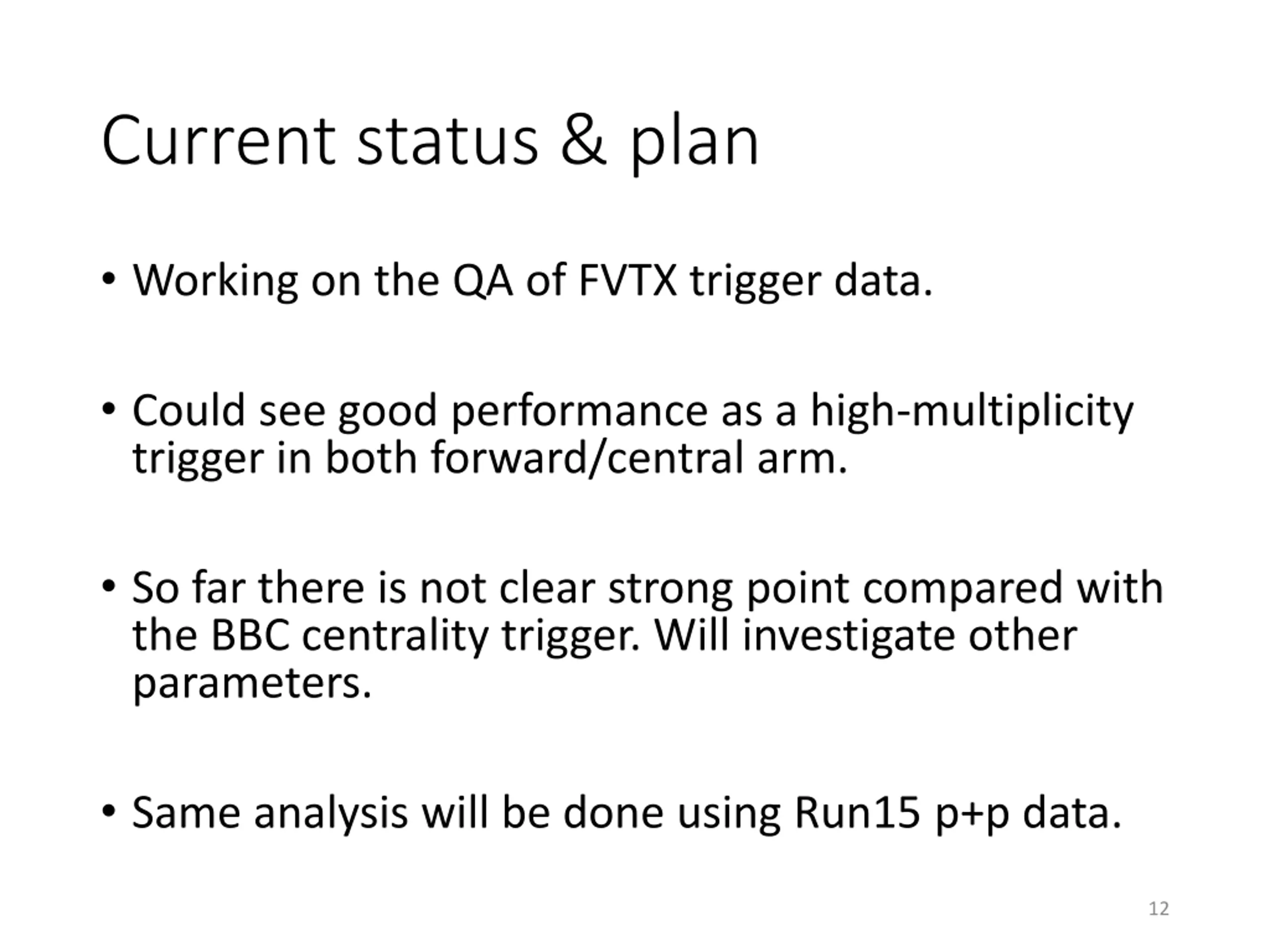 Current status & plan Working on the QA of FVTX trigger data. Could see good performance as a high-multiplicity trigger in both forward/central arm. So far there is not clear strong point compared with the BBC centrality trigger. Will investigate other parameters. Same analysis will be done using Run15 p+p data. 12
