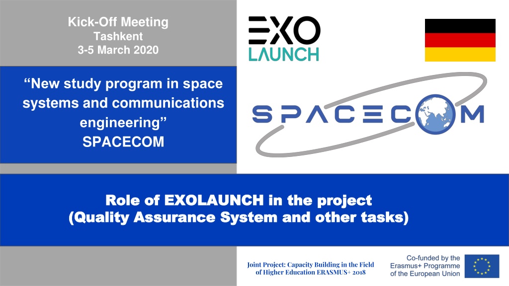 Kick-Off Meeting Tashkent 3-5 March 2020 New study program in space systems and communications engineering SPACECOM Role of EXOLAUNCH in the project Role of EXOLAUNCH in the project (Quality Assurance System and other tasks) (Quality Assurance System and other tasks) Joint Project: Capacity Building in the Field of Higher Education ERASMUS+ 2018