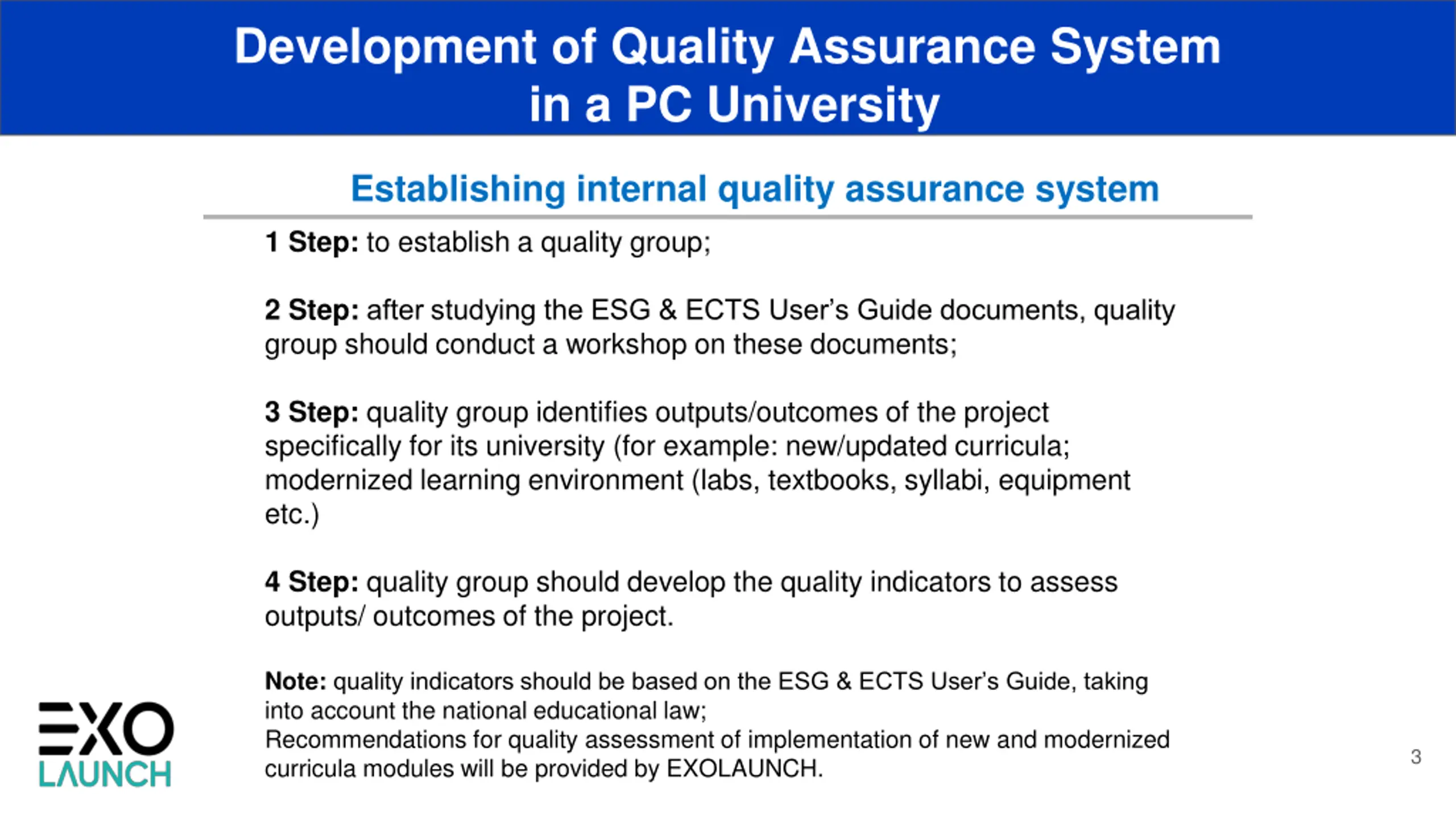 Development of Quality Assurance System in a PC University Establishing internal quality assurance system 1 Step: to establish a quality group; 2 Step: after studying the ESG & ECTS User s Guide documents, quality group should conduct a workshop on these documents; 3 Step: quality group identifies outputs/outcomes of the project specifically for its university (for example: new/updated curricula; modernized learning environment (labs, textbooks, syllabi, equipment etc.) 4 Step: quality group should develop the quality indicators to assess outputs/ outcomes of the project. Note: quality indicators should be based on the ESG & ECTS User s Guide, taking into account the national educational law; Recommendations for quality assessment of implementation of new and modernized curricula modules will be provided by EXOLAUNCH. 3