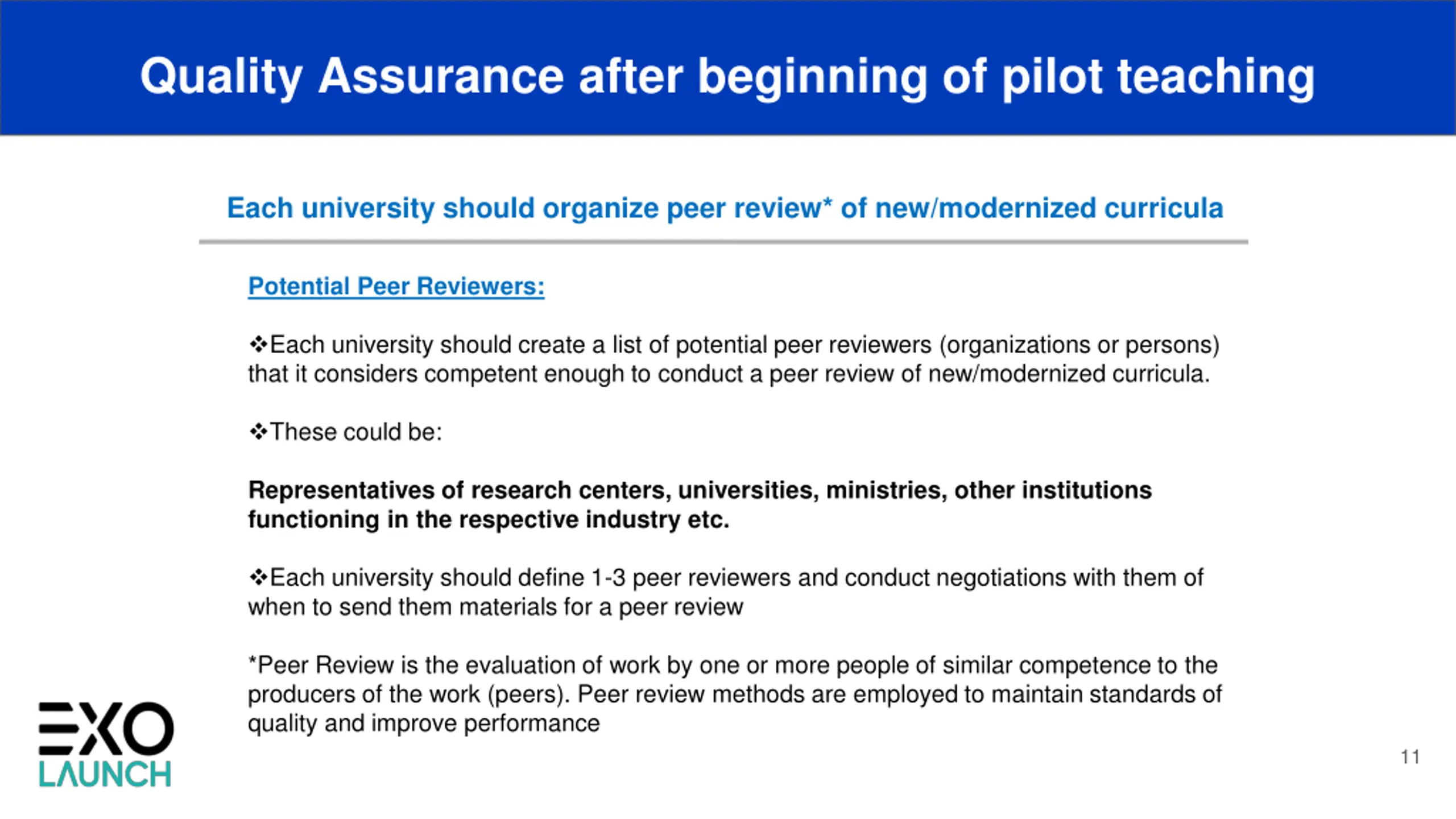 Quality Assurance after beginning of pilot teaching Each university should organize peer review* of new/modernized curricula Potential Peer Reviewers: Each university should create a list of potential peer reviewers (organizations or persons) that it considers competent enough to conduct a peer review of new/modernized curricula. These could be: Representatives of research centers, universities, ministries, other institutions functioning in the respective industry etc. Each university should define 1-3 peer reviewers and conduct negotiations with them of when to send them materials for a peer review *Peer Review is the evaluation of work by one or more people of similar competence to the producers of the work (peers). Peer review methods are employed to maintain standards of quality and improve performance 11