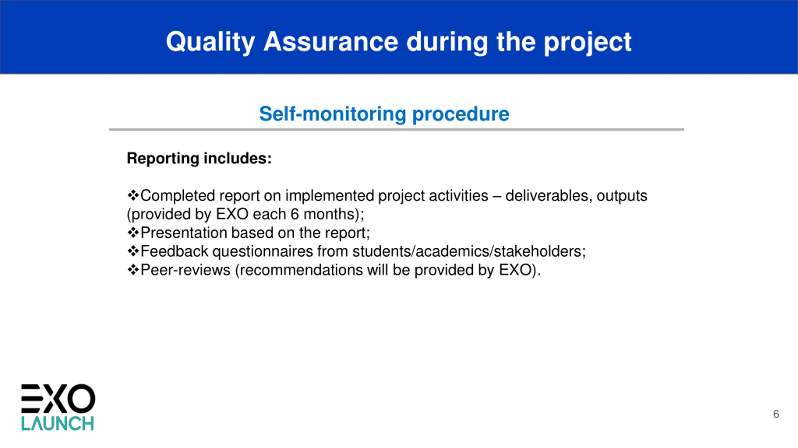 Quality Assurance during the project Self-monitoring procedure Reporting includes: Completed report on implemented project activities deliverables, outputs (provided by EXO each 6 months); Presentation based on the report; Feedback questionnaires from students/academics/stakeholders; Peer-reviews (recommendations will be provided by EXO). 6