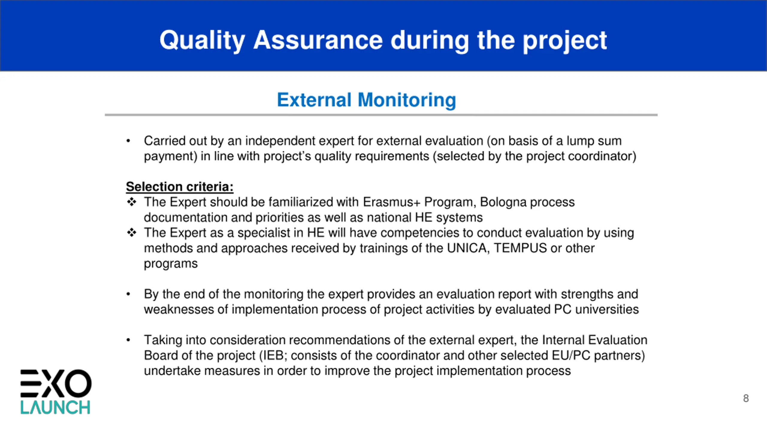 Quality Assurance during the project Apart from the Self-Monitoring reports, there are other reports which should be prepared by the project coordinator interim and final reports Self monitoring reports: each partner university send to project coordinator and EXO M6, M12, M18, M24, M30, M36 Interim report: prepared by project coordinator on basis of self monitoring reports and WP leaders reports M18 Final report: prepared by project coordinator on basis of self monitoring reports and WP leaders reports M36 Rep6M Rep12M Rep18M Rep24M Rep30M Rep36M Start November 2019 End November 2022 April 2021 7