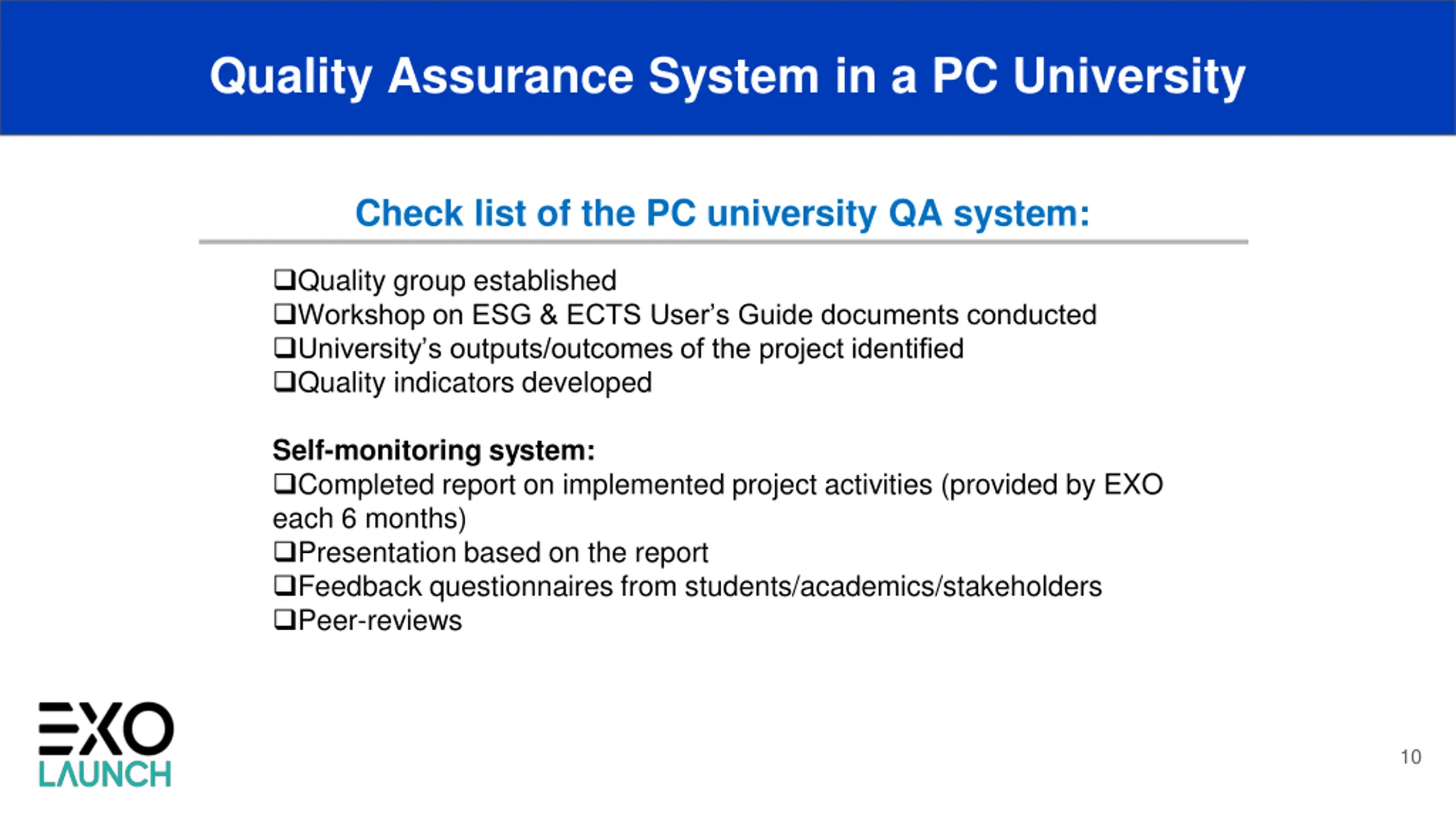 Quality Assurance during the project Inter-Project Coaching (*optional) Representatives of PC universities can organize a meeting (virtual or face-to-face) in order to share experience of self-monitoring process/implementation of project activities Due to such peer-review meetings representatives can ensure that quality assurance activities are fit for purpose, comparable, manageable and accessible. The meeting should be recorded in a form of a minutes and handed in to the project coordinator 9