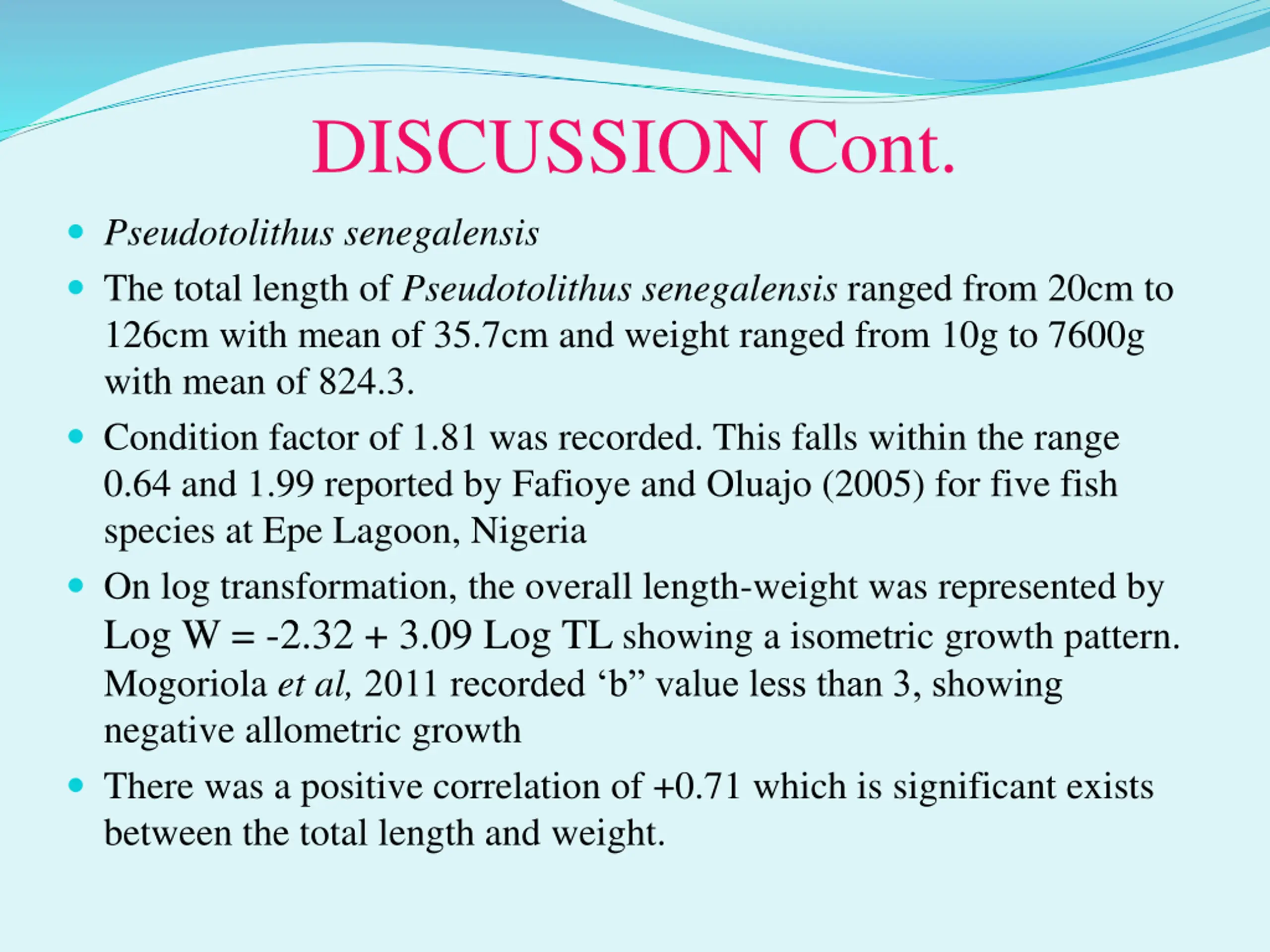 DISCUSSION Cont. Pseudotolithus senegalensis The total length of Pseudotolithus senegalensis ranged from 20cm to 126cm with mean of 35.7cm and weight ranged from 10g to 7600g with mean of 824.3. Condition factor of 1.81 was recorded. This falls within the range 0.64 and 1.99 reported by Fafioye and Oluajo (2005) for five fish species at Epe Lagoon, Nigeria On log transformation, the overall length-weight was represented by Log W = -2.32 + 3.09 Log TL showing a isometric growth pattern. Mogoriola et al, 2011 recorded b value less than 3, showing negative allometric growth There was a positive correlation of +0.71 which is significant exists between the total length and weight.