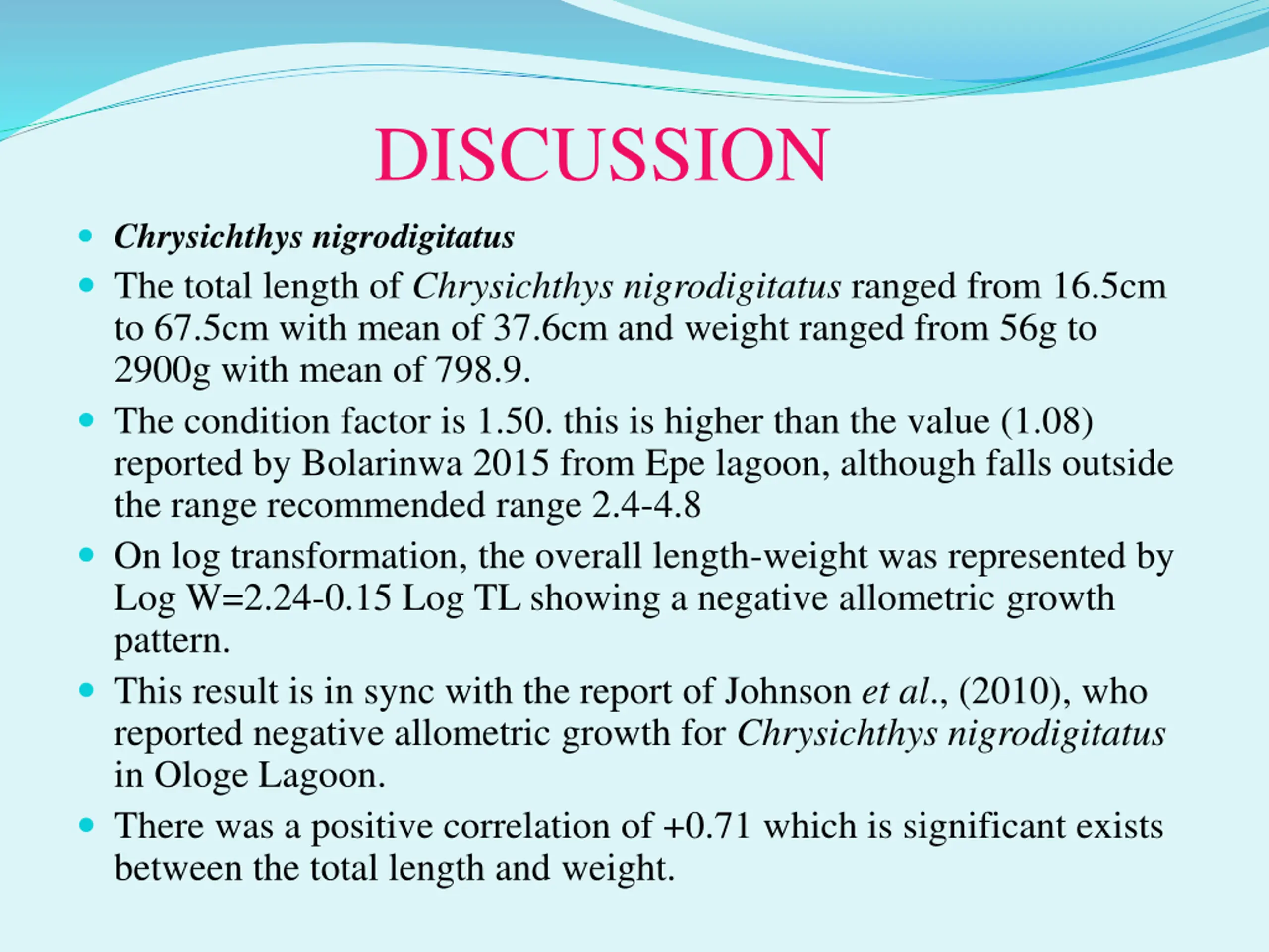 DISCUSSION Chrysichthys nigrodigitatus The total length of Chrysichthys nigrodigitatus ranged from 16.5cm to 67.5cm with mean of 37.6cm and weight ranged from 56g to 2900g with mean of 798.9. The condition factor is 1.50. this is higher than the value (1.08) reported by Bolarinwa 2015 from Epe lagoon, although falls outside the range recommended range 2.4-4.8 On log transformation, the overall length-weight was represented by Log W=2.24-0.15 Log TL showing a negative allometric growth pattern. This result is in sync with the report of Johnson et al., (2010), who reported negative allometric growth for Chrysichthys nigrodigitatus in Ologe Lagoon. There was a positive correlation of +0.71 which is significant exists between the total length and weight.